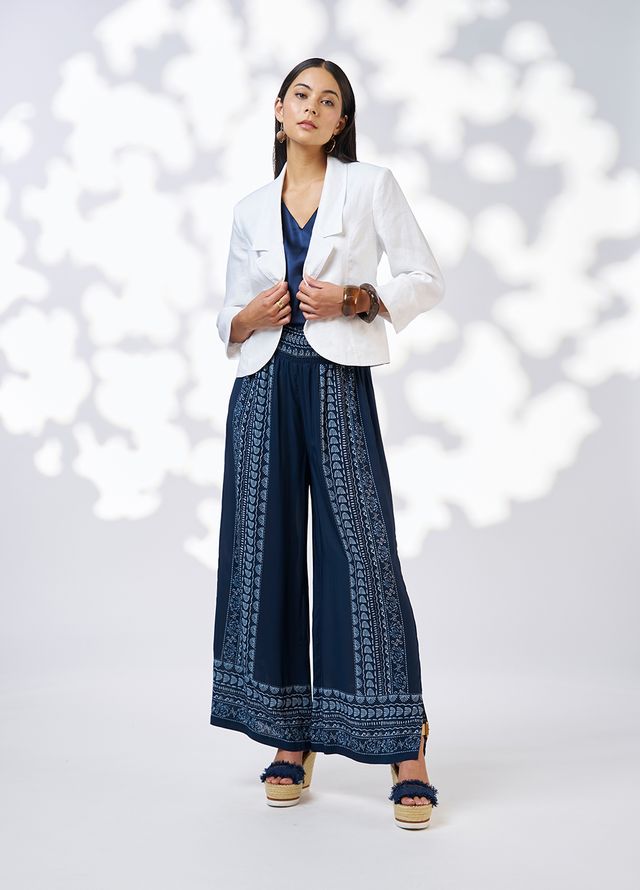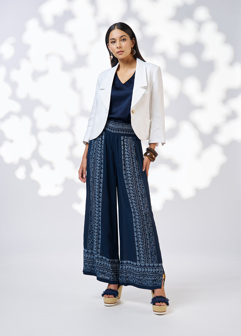 Silky wide leg palazzo pant with a deep shirred waistband and forward side seams for a flattering fit. Functional pockets.