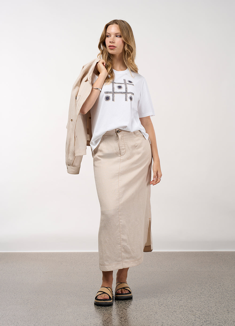 Linen blend skirt, with side splits, back pockets and a functional fly, with an elasticated back waist, featuring contrast twin needle detailing to elevate the styling.