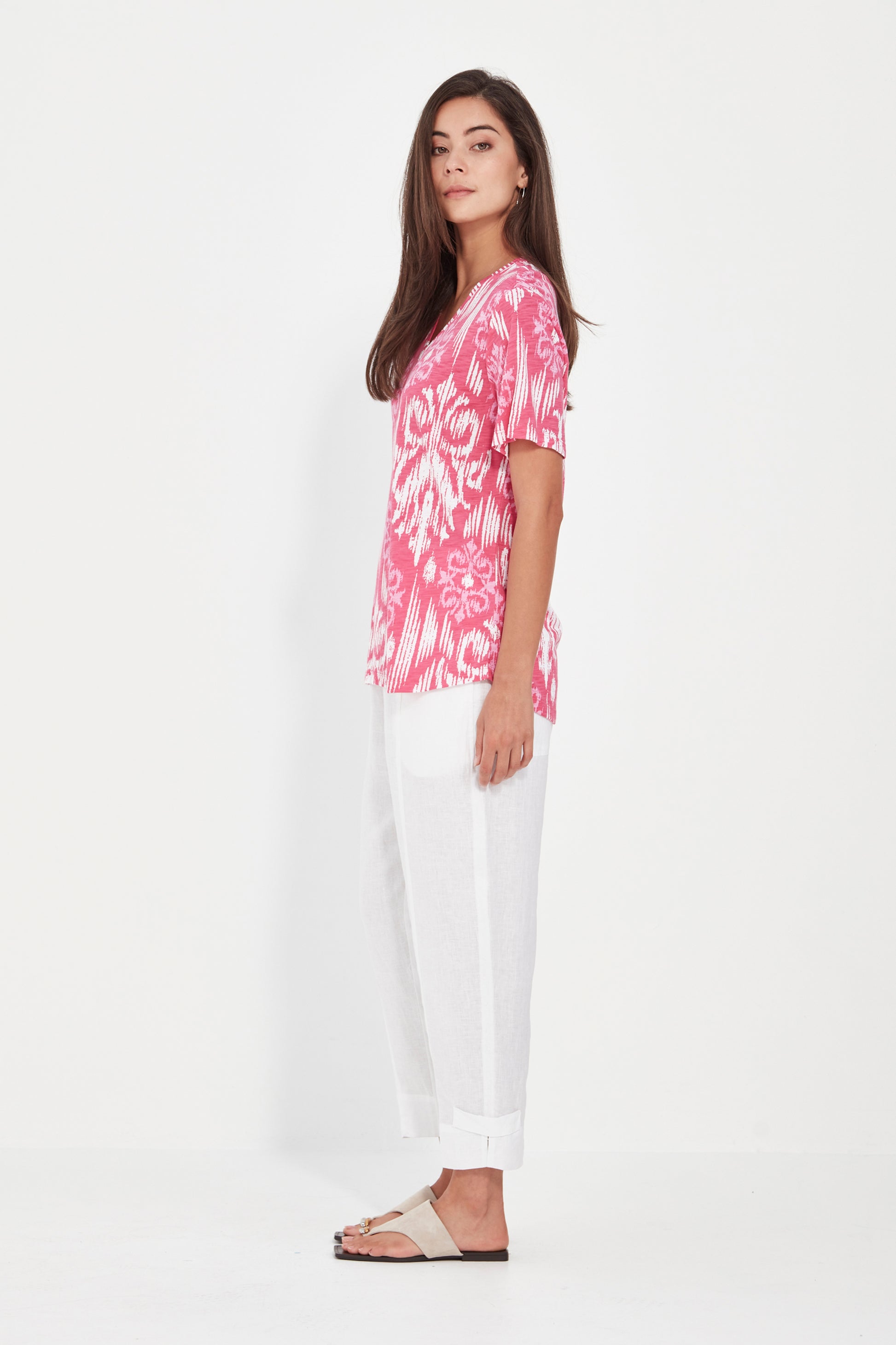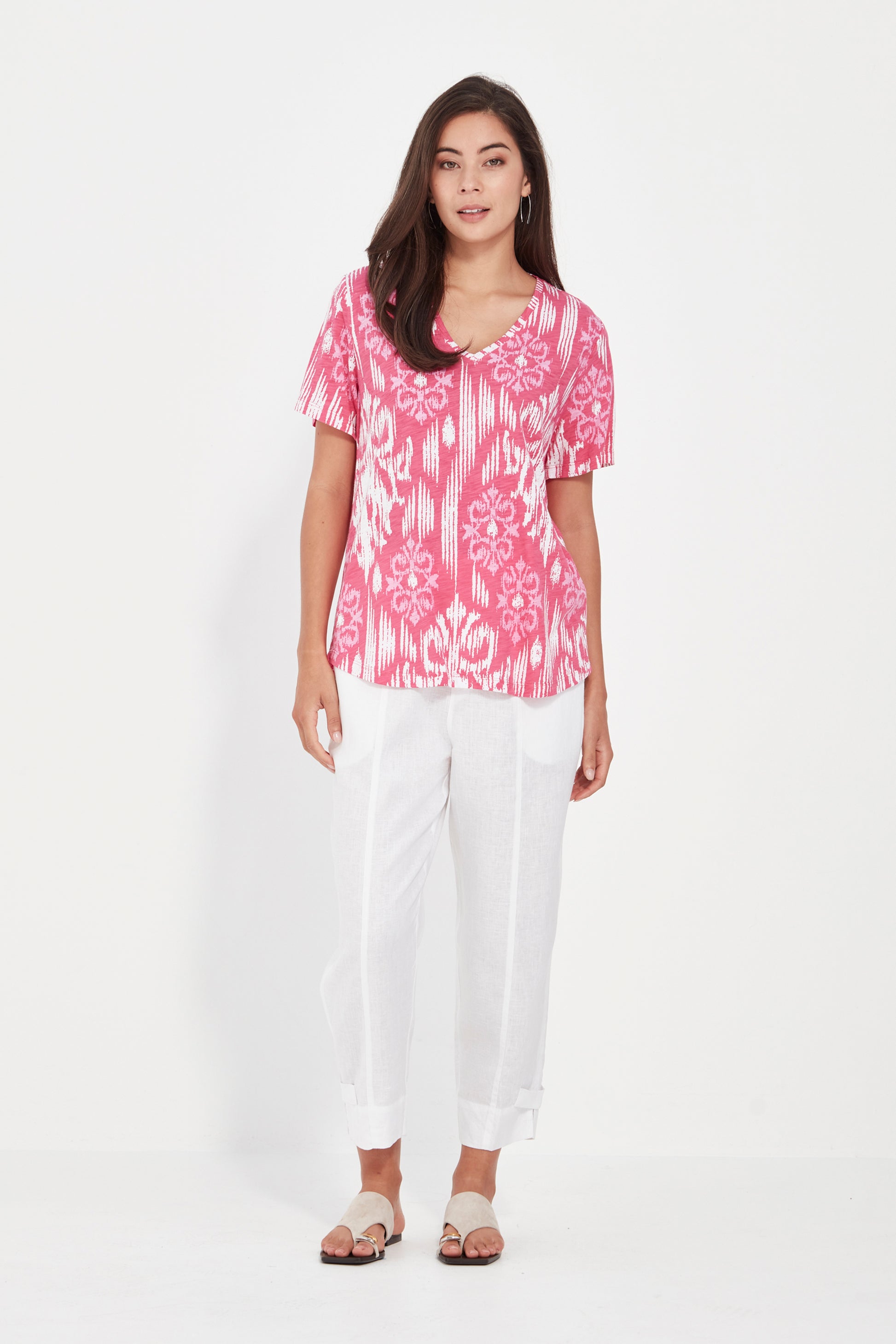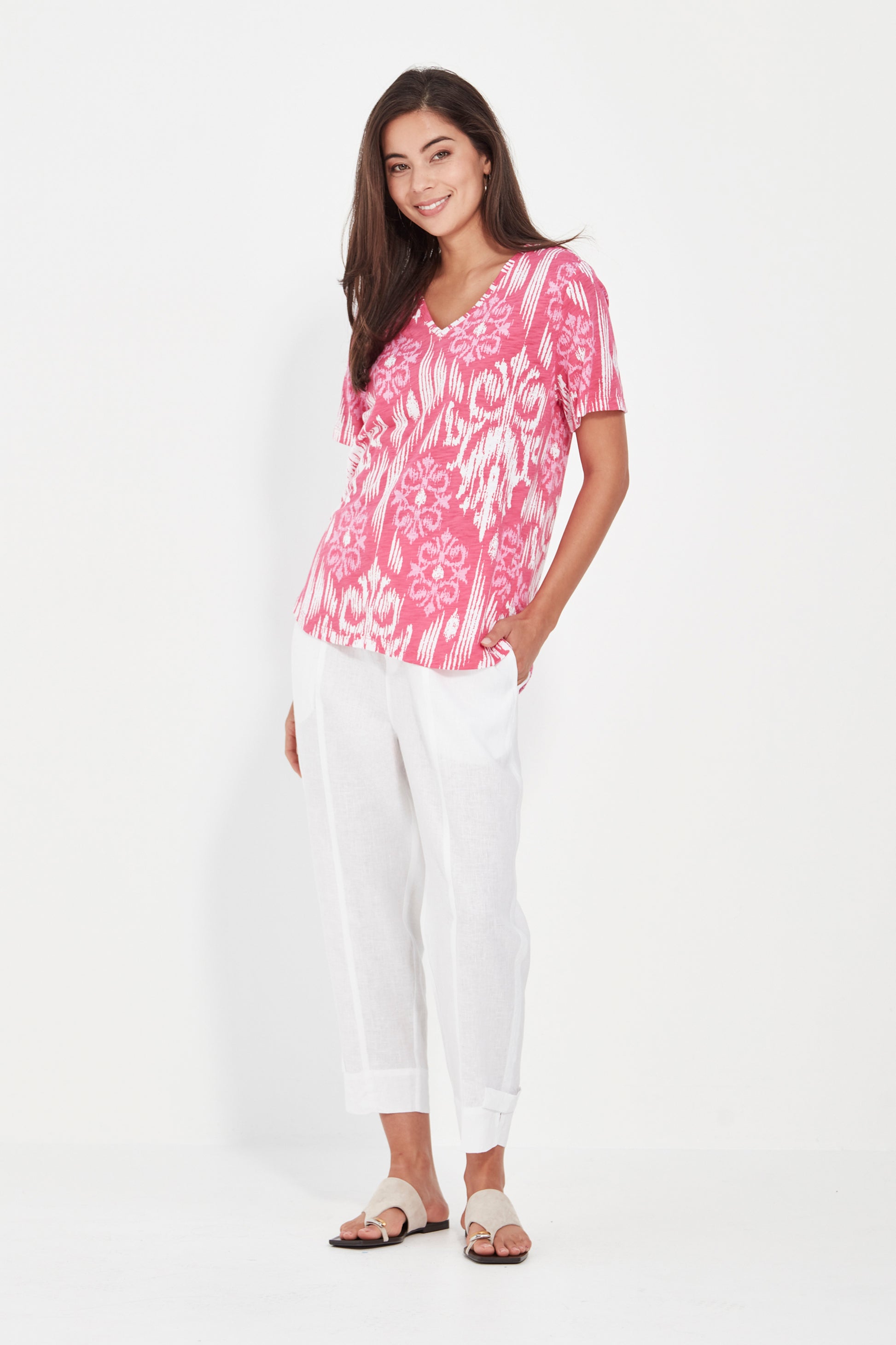 The Calibrate Top is an easy-wear T-shirt crafted in a soft cotton-modal blend for a lightweight, breathable feel. Featuring an exclusive Verge print, the vibrant pop of green against the crisp white background adds fresh energy to your wardrobe. With a flattering V-neckline and short sleeves, it’s the perfect piece to pair back with white pants for a clean, modern look.