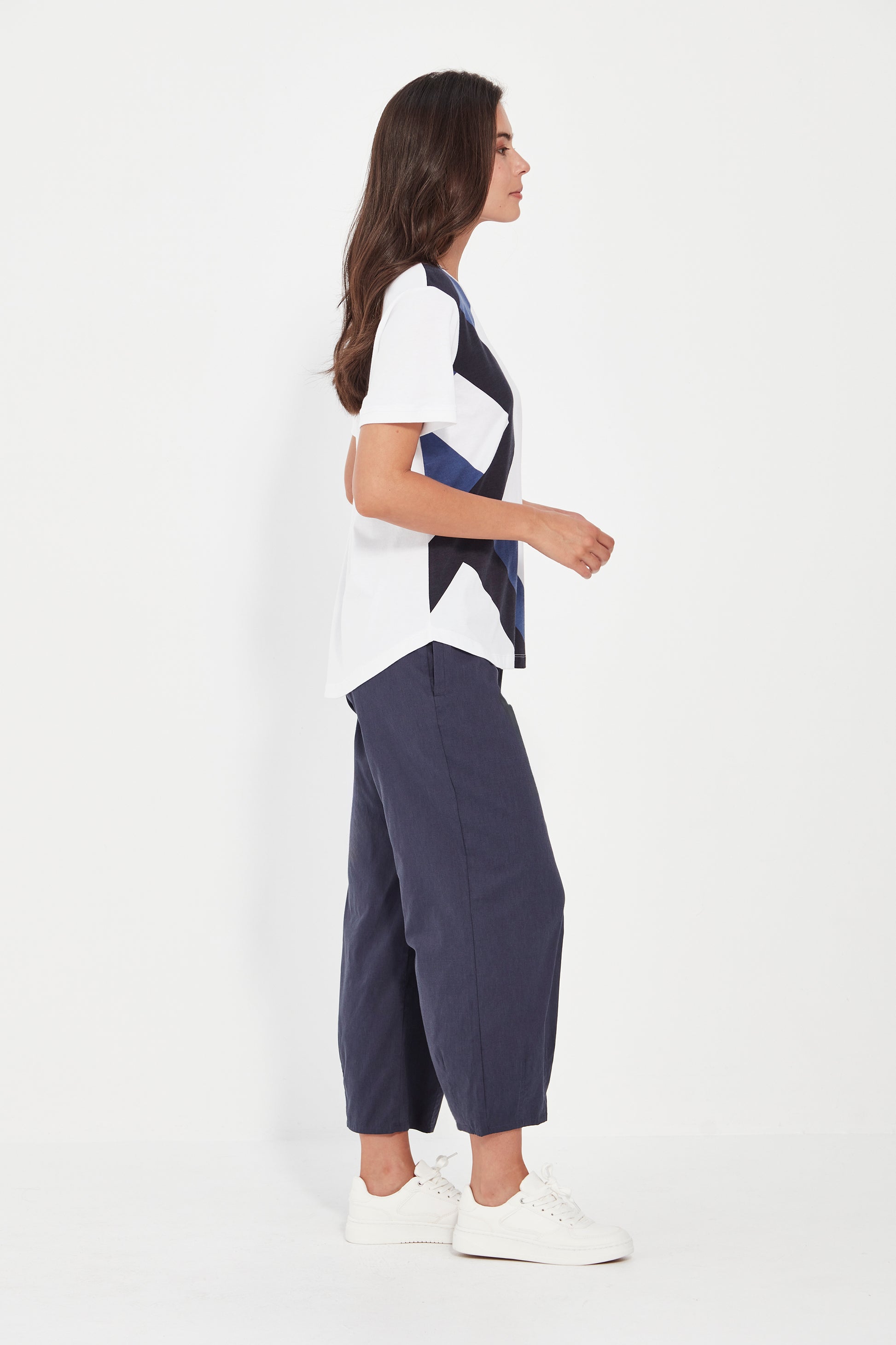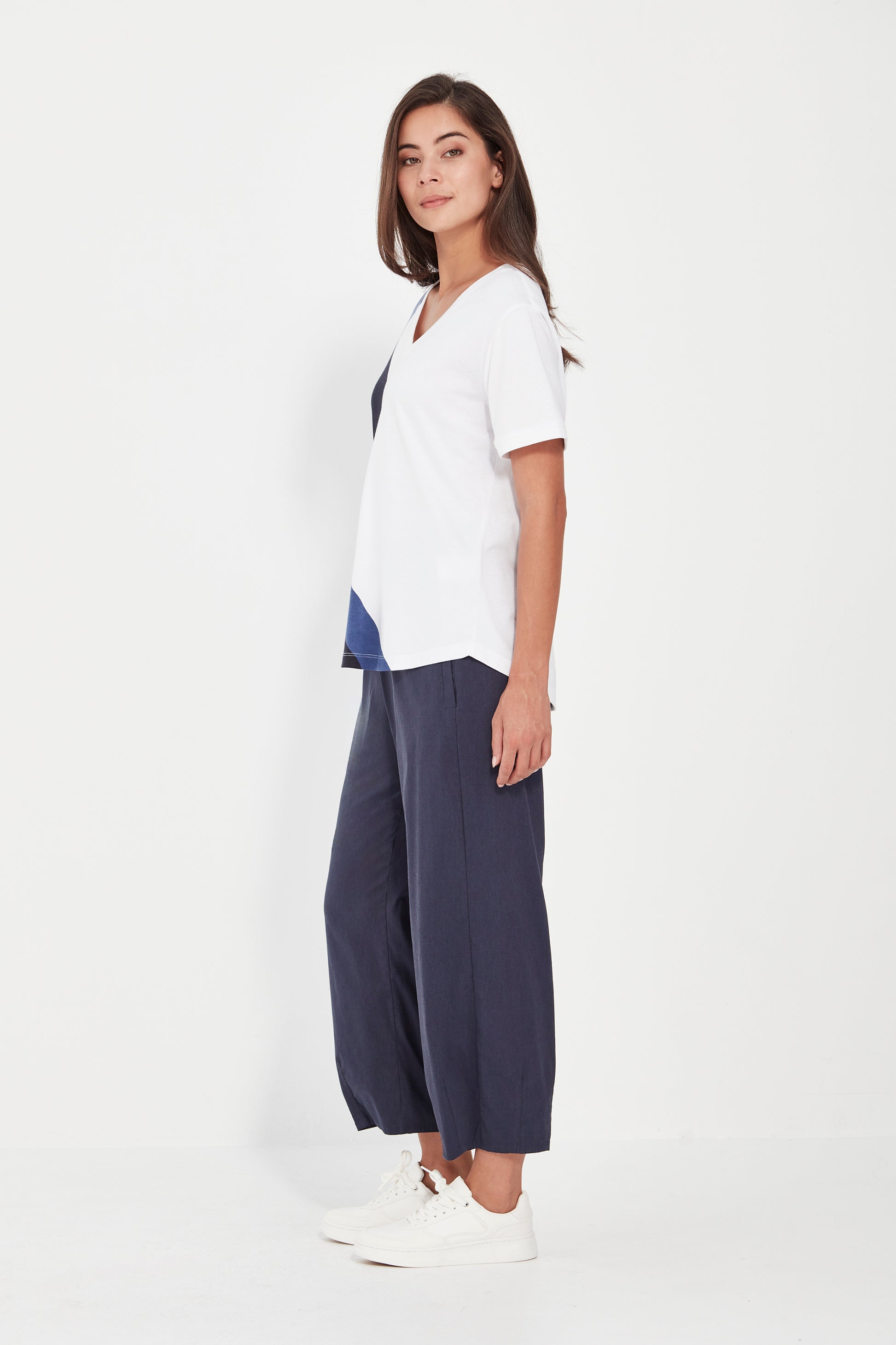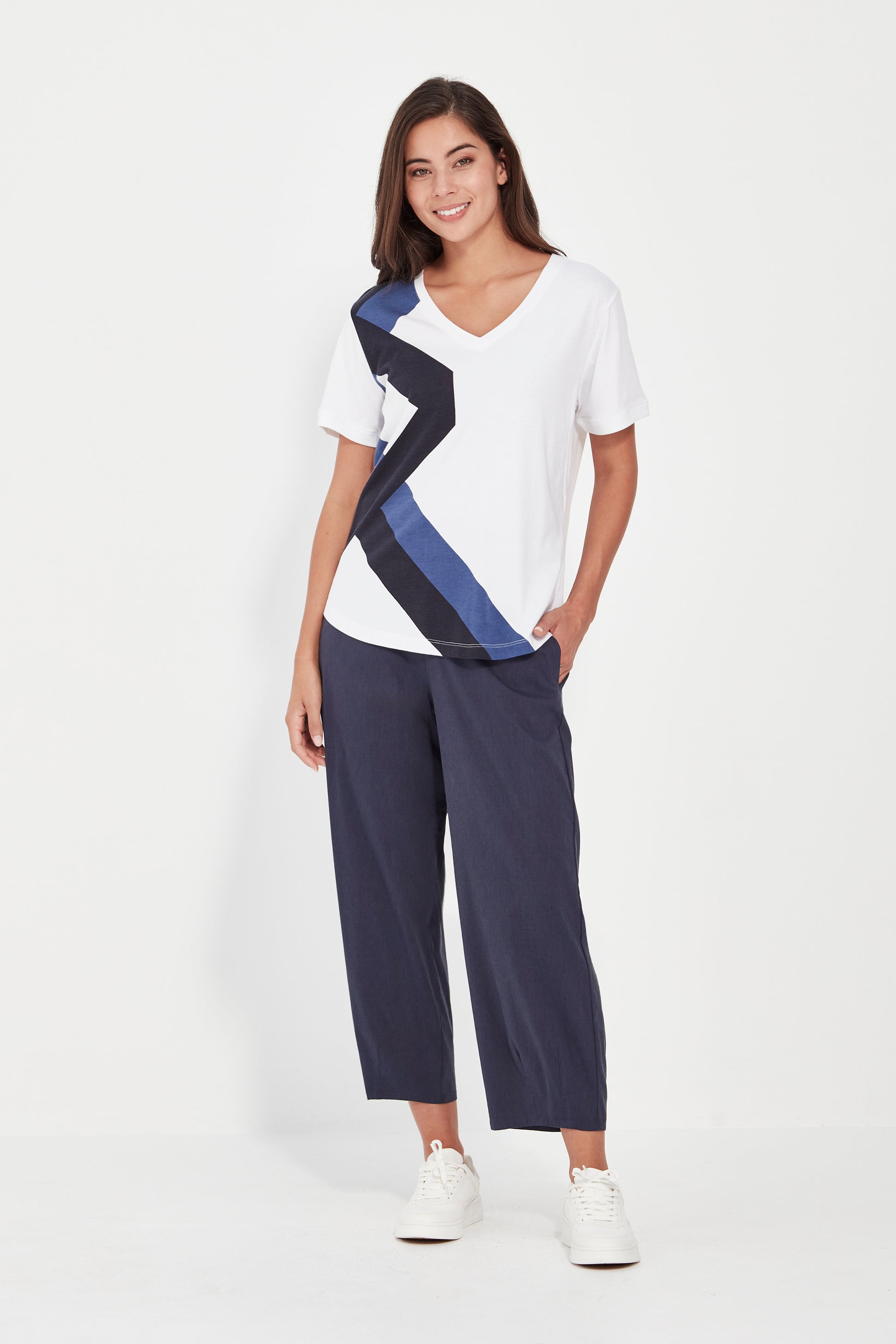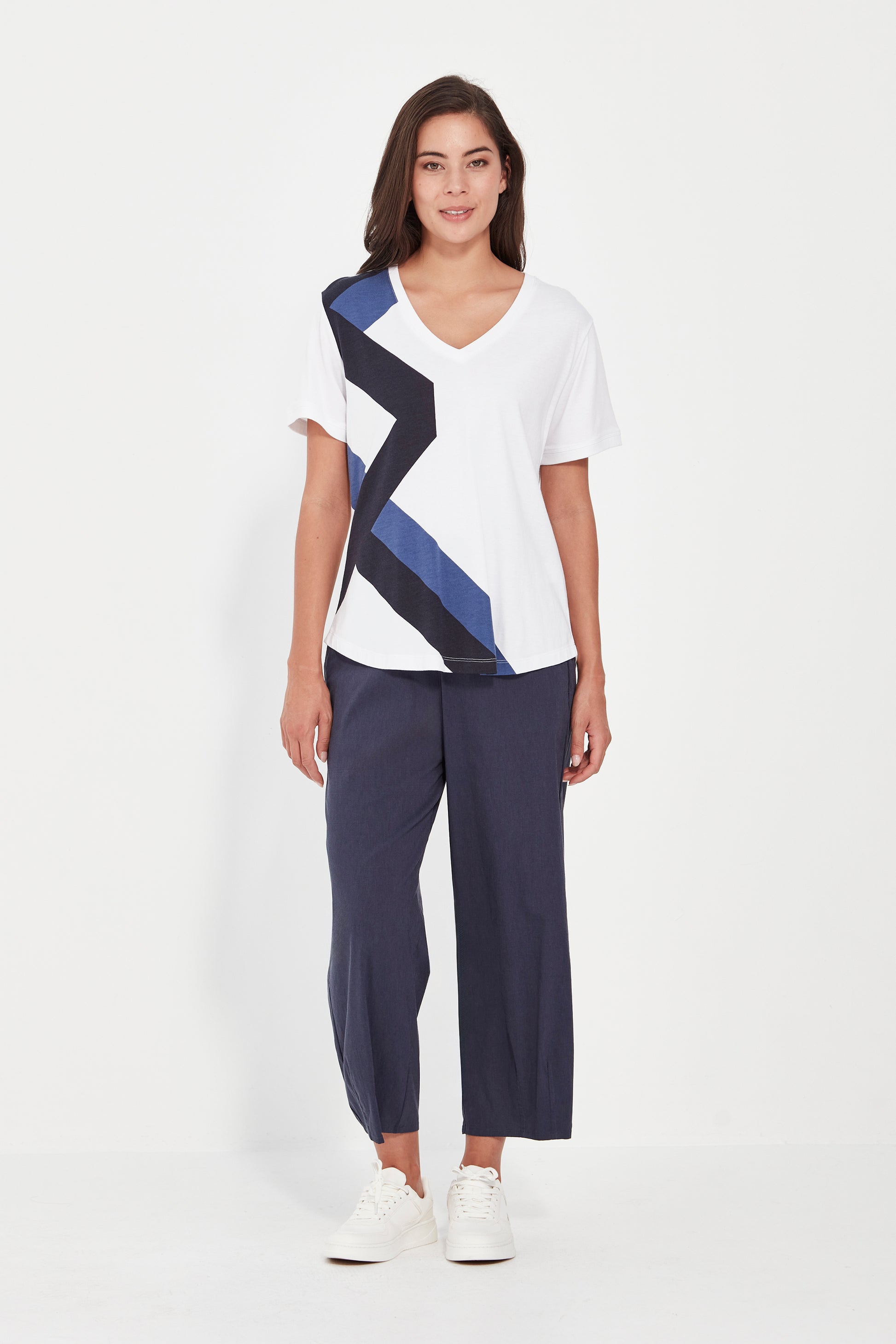 The Coil Top is crafted in a soft cotton-modal jersey knit for all-day comfort. Featuring a flattering V neckline and short sleeves, it’s elevated by a striking geo print that runs down one side—adding a bold, modern touch to this everyday essential.
