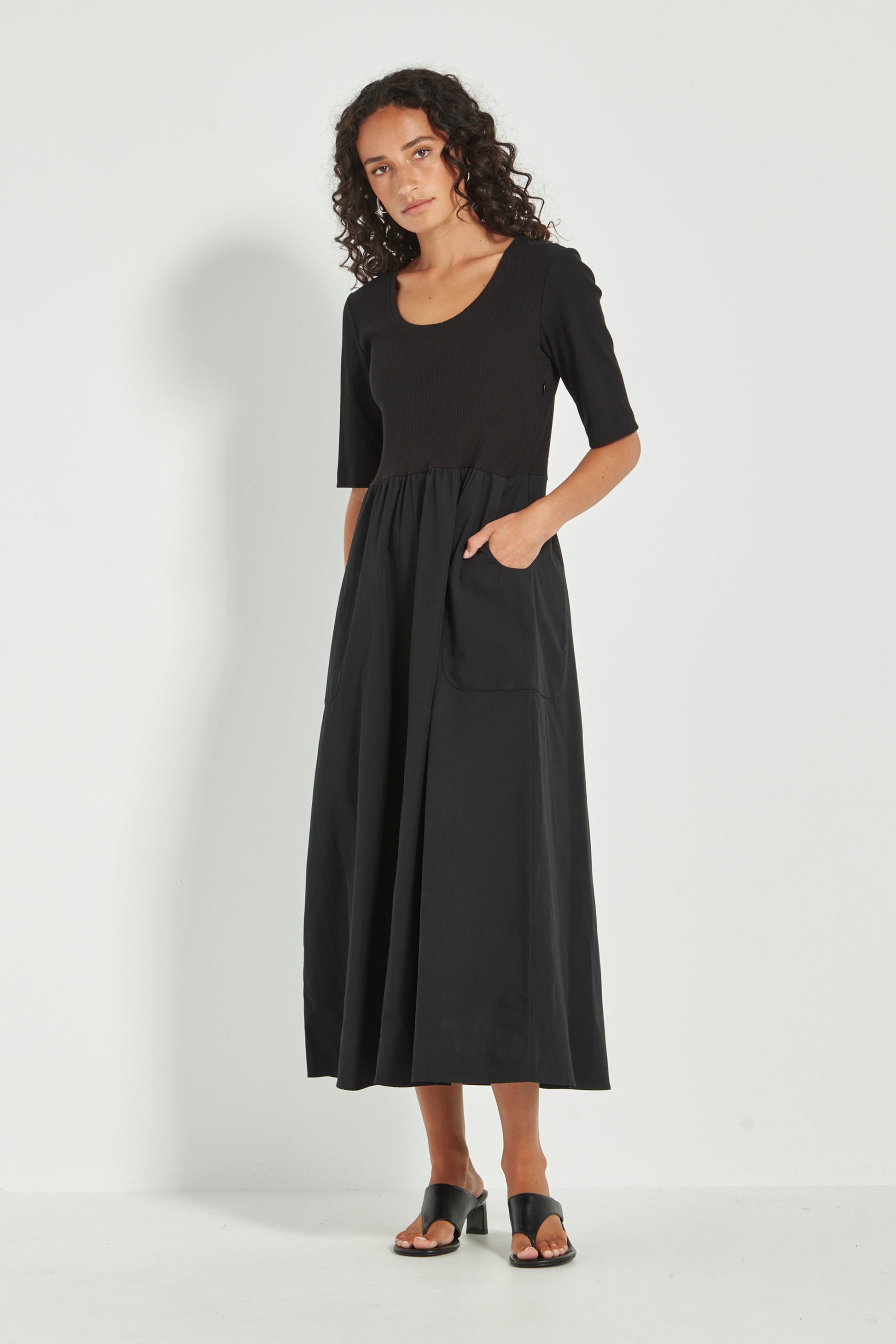 Effortlessly elegant, the Contessa Dress is designed to take you from day to night with ease. A high-waisted poplin skirt gathers softly to skim the hips, complemented by curved front pockets for a flattering, functional finish. The fitted ribbed bodice offers comfortable stretch, with a scoop neckline and slim elbow-length sleeves to balance the silhouette. Finished at a midi length, with a side zip for function, it’s the kind of piece you’ll reach for again and again.