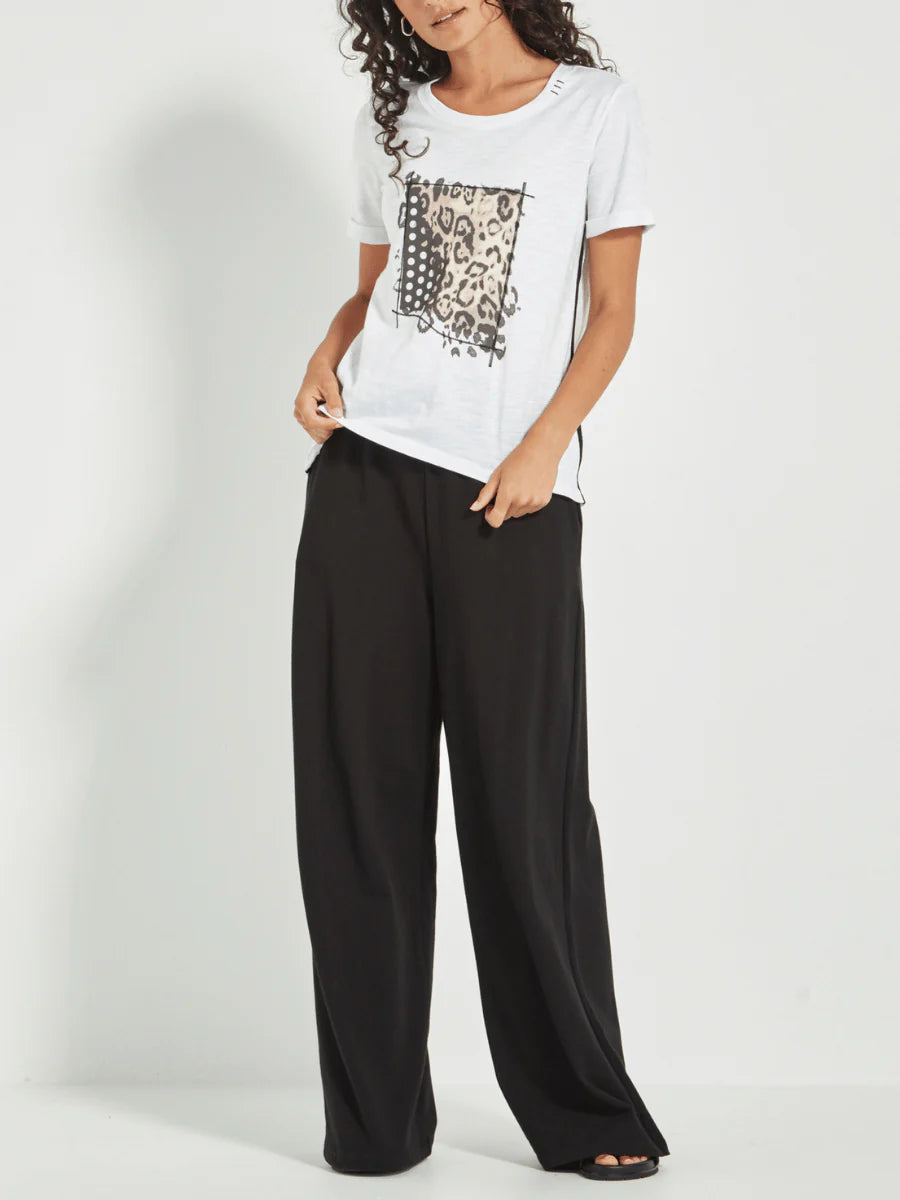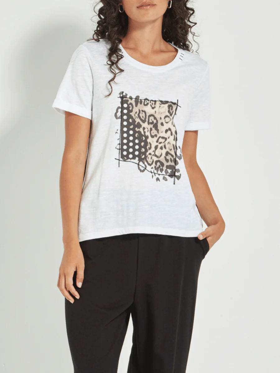 The Dusty Top is a fresh take on the everyday tee, crafted in 100% cotton with a modern animal-inspired placement print and subtle embroidered frame the print. Featuring a crew neckline and sleeves that fall to the mid-upper arm with rolled self-fabric cuffs, it strikes the perfect balance between casual and considered. Contrast black herringbone tape runs down each side seam for a sporty, directional twist. Finished with a curved hemline that falls below the hip, the Dusty Top is a versatile layer that elevates off-duty styling with ease.