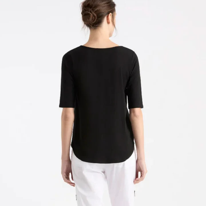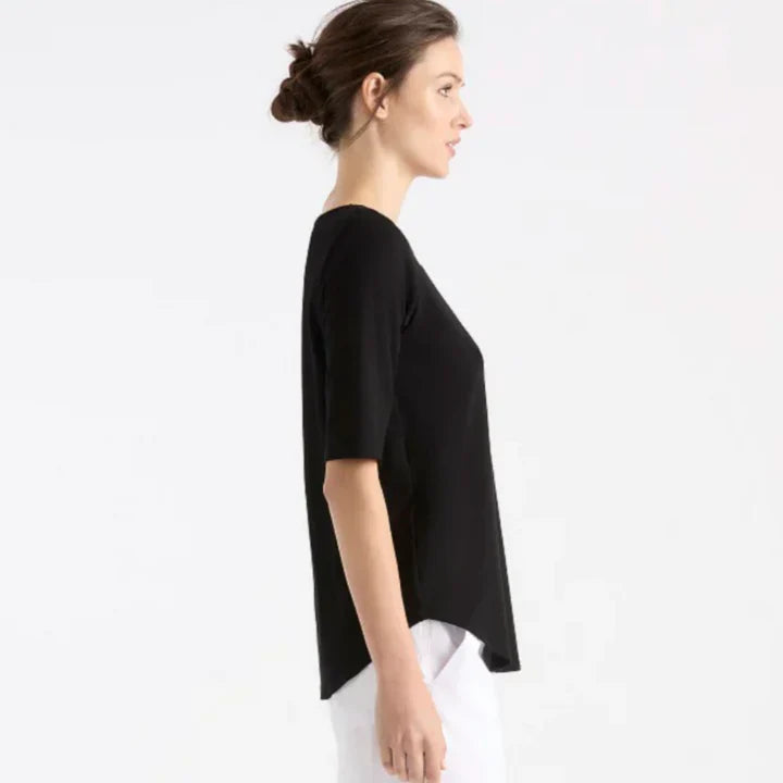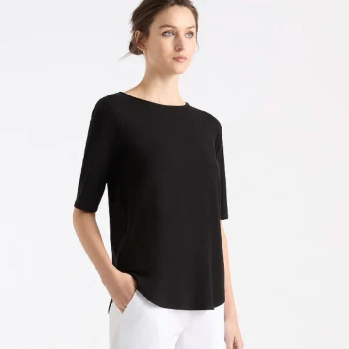 Introducing the Mela Purdie Elbow Cafe T Jersey, the perfect trans-seasonal essential crafted in their heritage midweight matte jersey material. This garment features a neat fit, boat neckline, and elbow length sleeves, offering a stylish and comfortable look. Made and designed with love in Australia.
