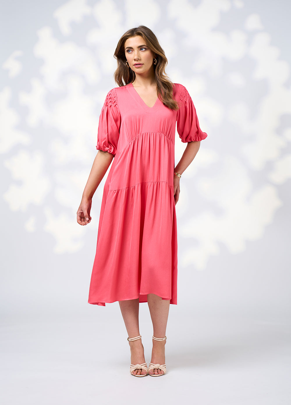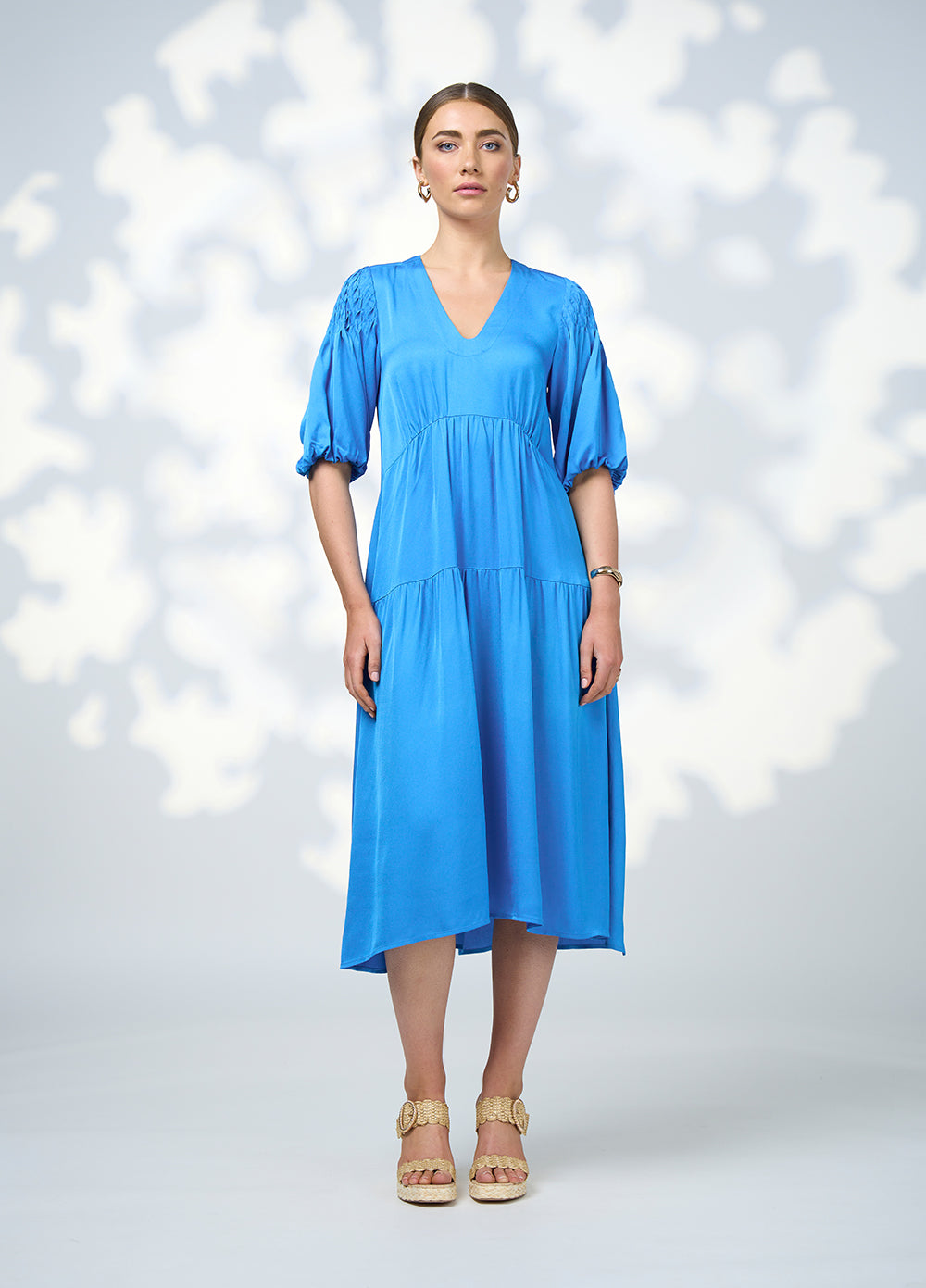 Midi dress with a V neckline and shaped front waist design and turned back elasticated cuffs. Featuring smocking tuck detailing on the shoulders to elevate the style.
