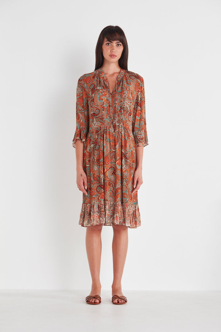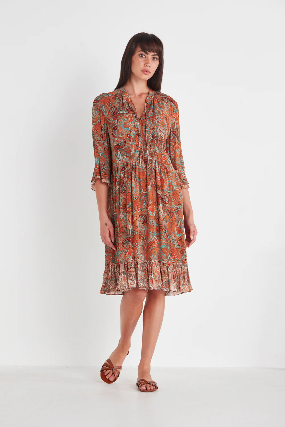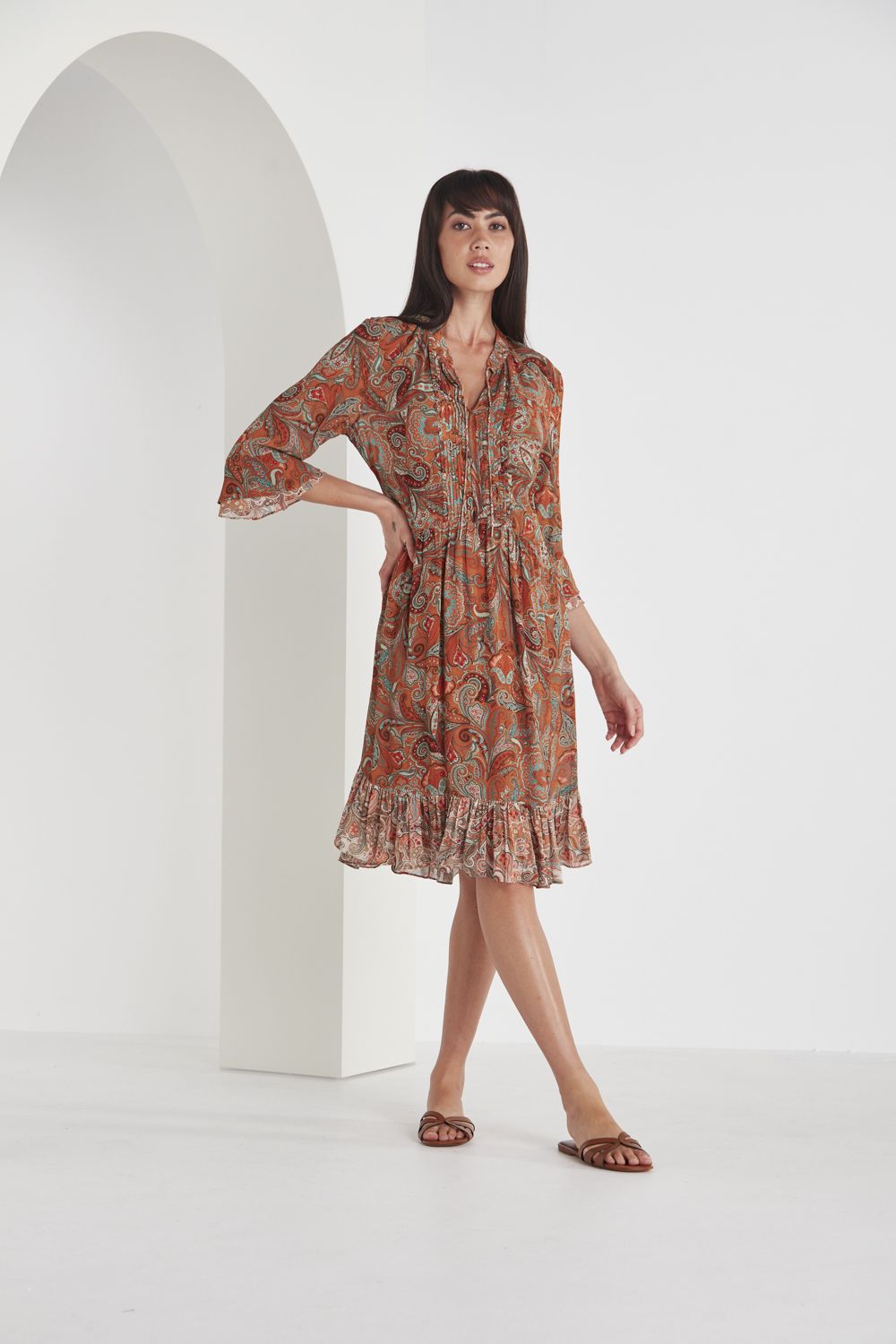 Relaxed fit Karma print dress with V neckline and feature pintuck detail on front panels. Low Mandarin collar with neckties. Sleeve falls below the elbow with fluted feature. Contrast spliced ruffle hemline. The Karma dress falls below the knee.