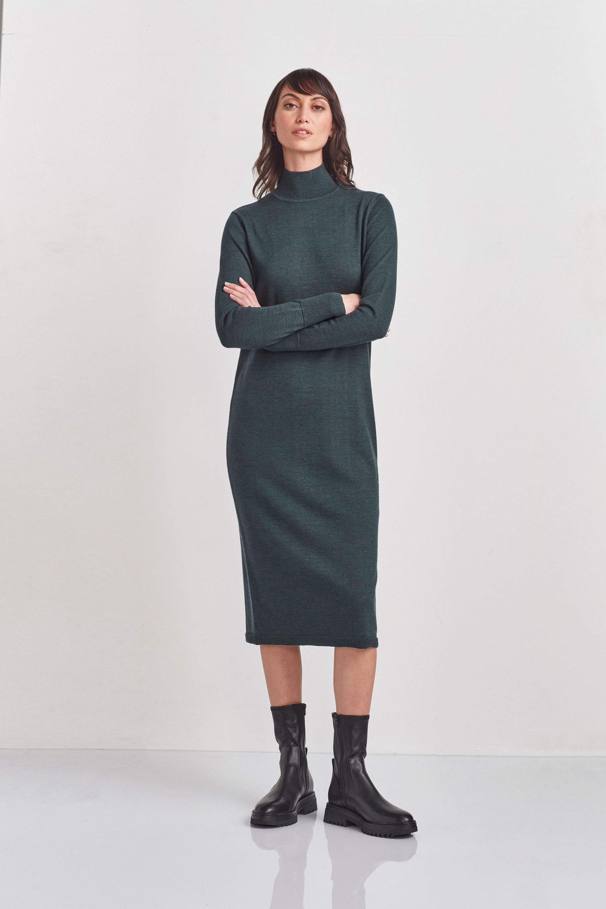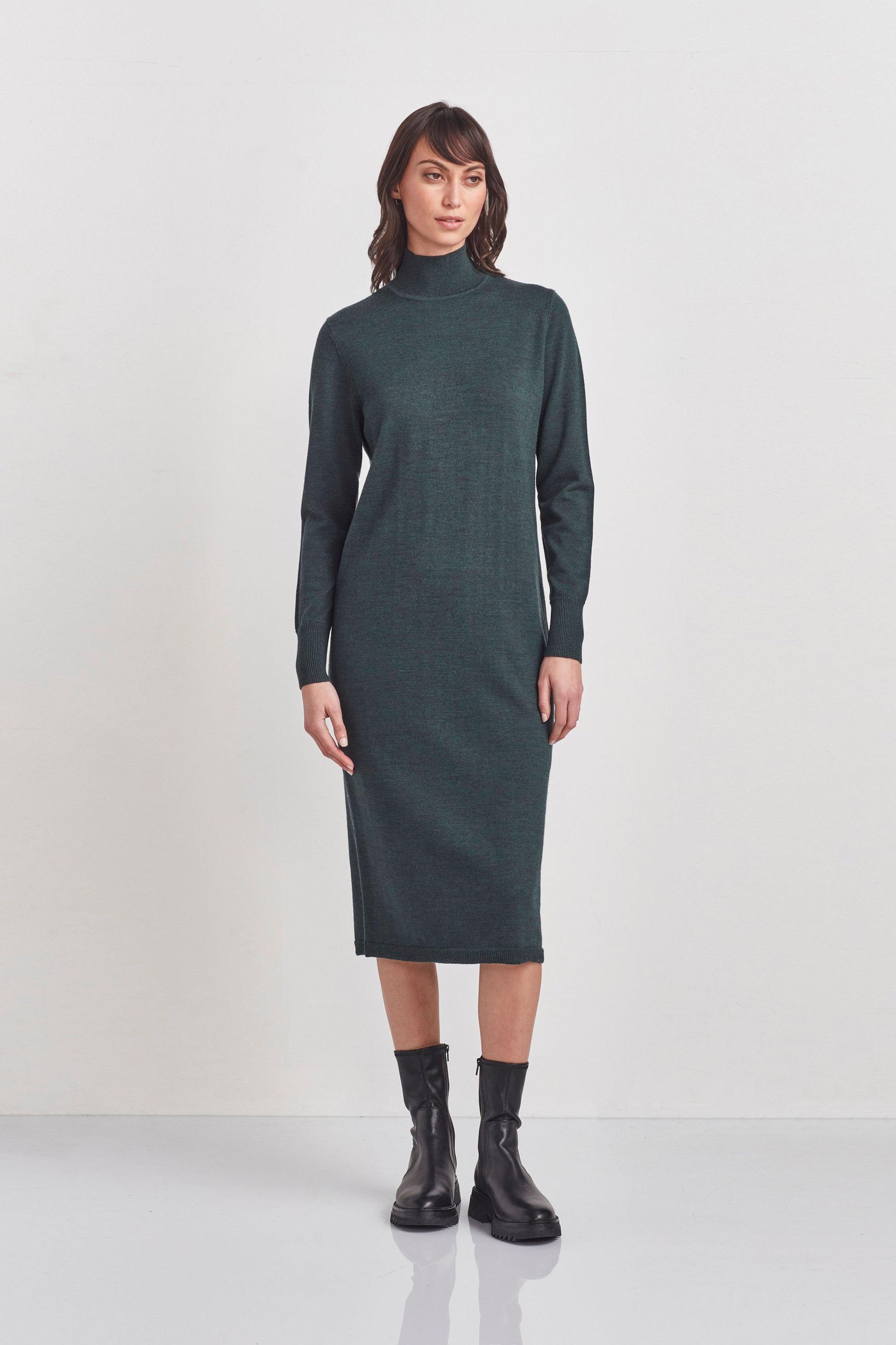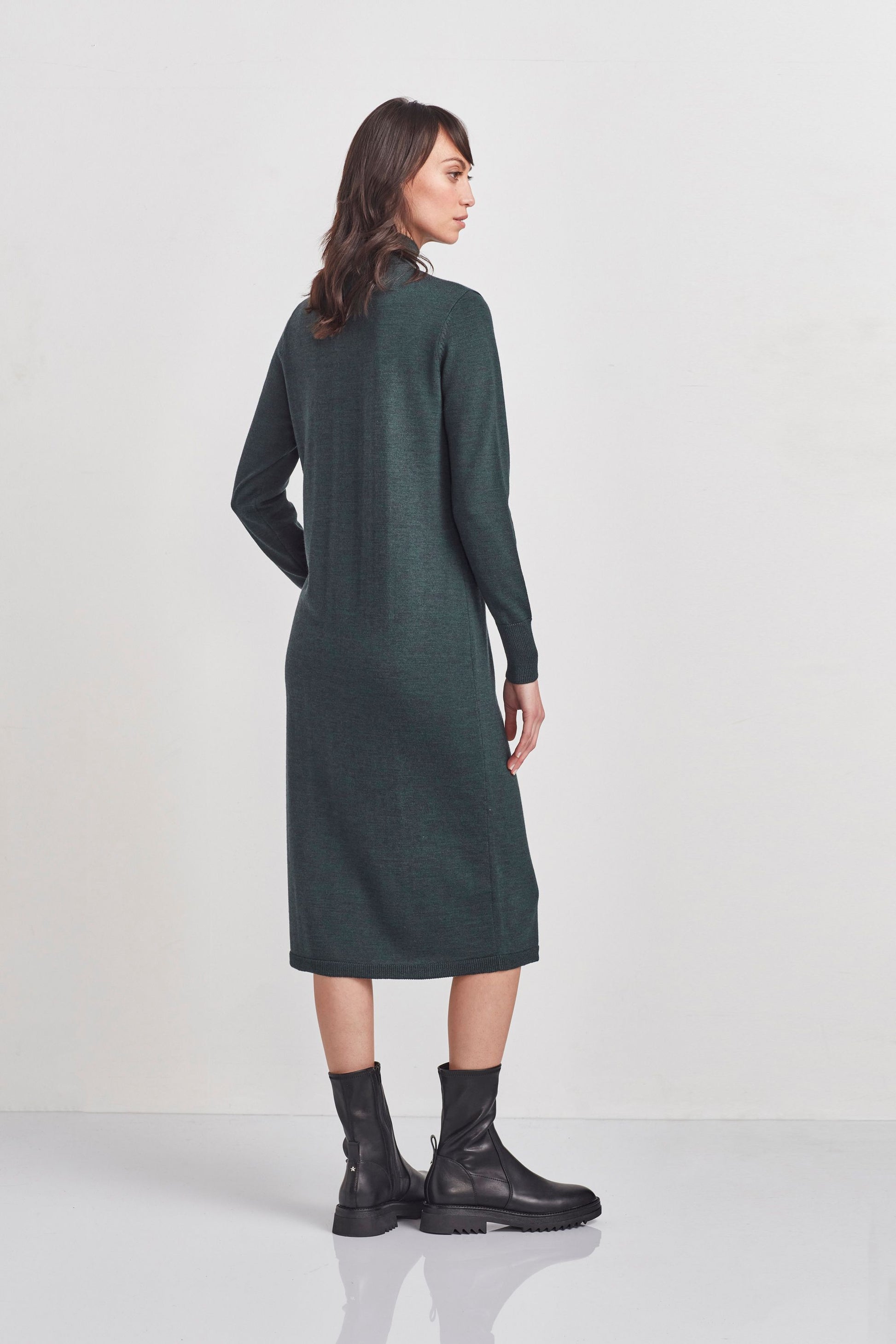 100% Extra fine Merino wool dress available in Black or Forest. Classic sheath dress with mock turtle neckline and full length sleeve. The sleeve has a deep rib cuff. Slim rib hemline. The Kiki dress falls to mid calf.