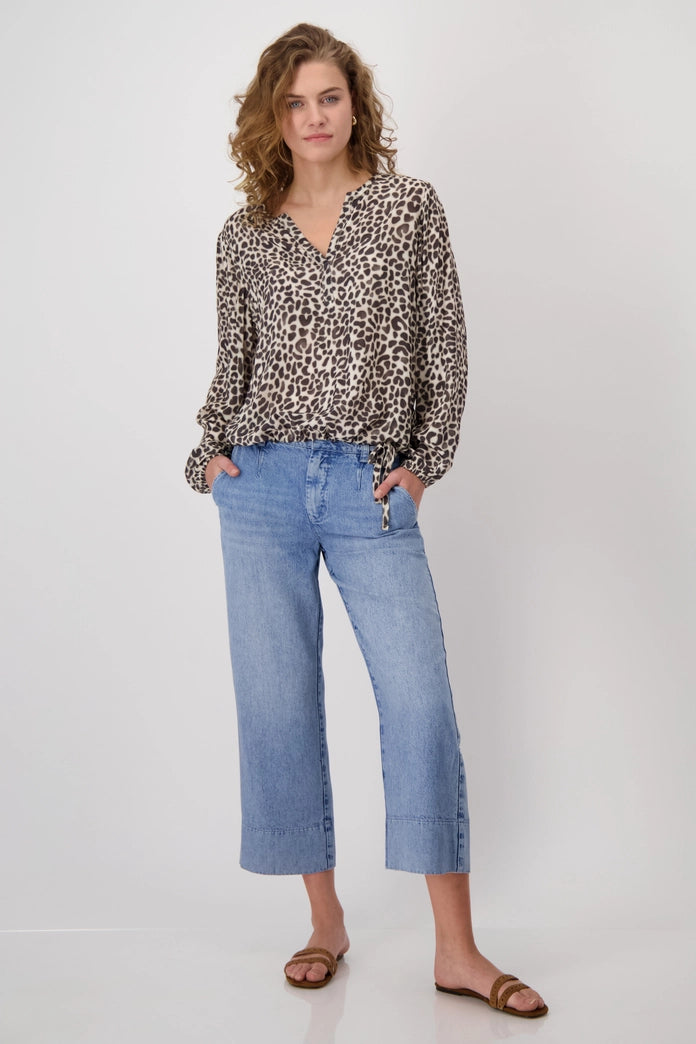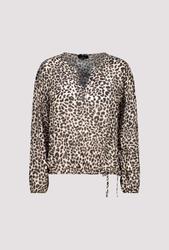 The blouse with leopard pattern is made of 100% viscose and has a round neckline with a slit. The long sleeves have an elasticated inlay and the hem can be gathered with a tie string. 100% viscose