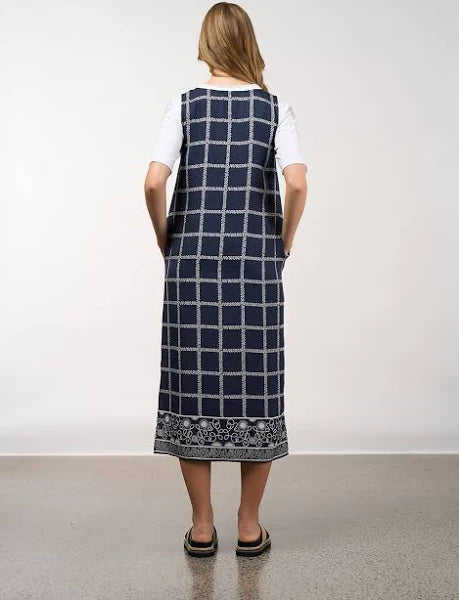 Printed sleeveless dress with a contrast print border at the hem, with in-seam pockets and deep side splits. Designed to be worn on it's own or layered over a tee.