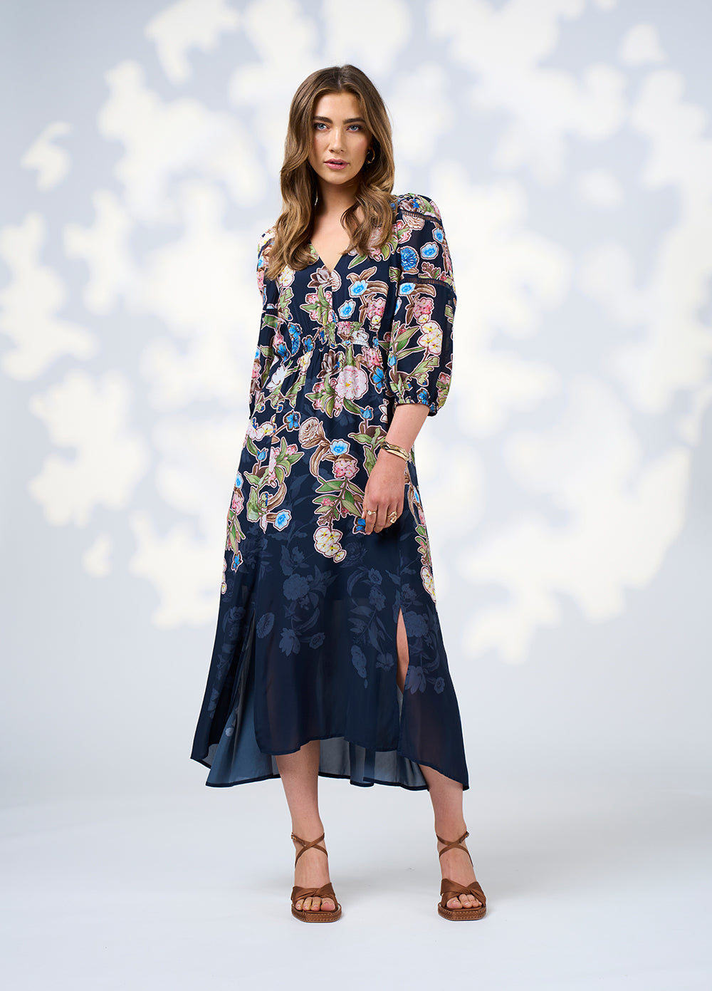 Printed midi dress with a V neckline with princess panels, and splits at front seams. Featuring inserted lace ladder trim on sleeves and shirring detail under bust and back waist, with elasticated cuffs. Fully Lined.