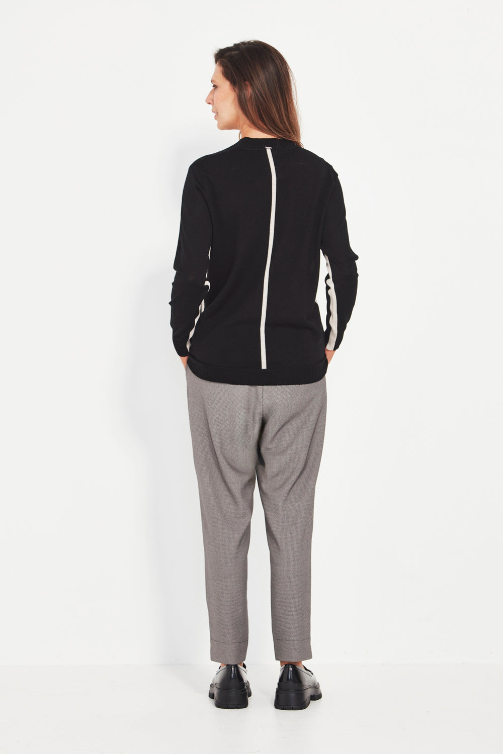 Contrast trim on the center back and along the sides