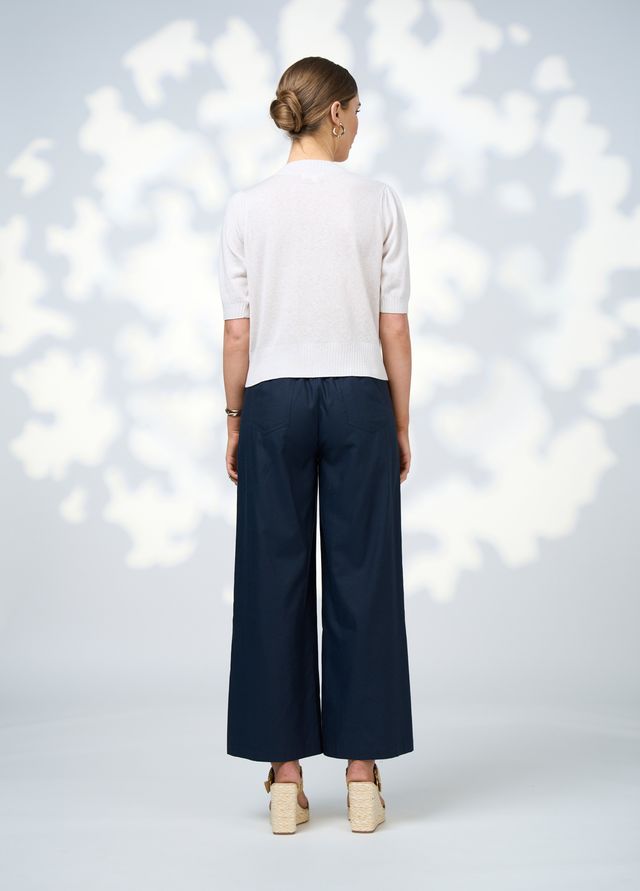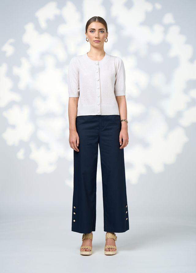 Short sleeve, fitted cardi n a metallic cotton cashmere to add shimmer and elevate your look. Features shoulder tucks to add subtle sleeve volume, self knitted covered buttons and deep ribbing detail.