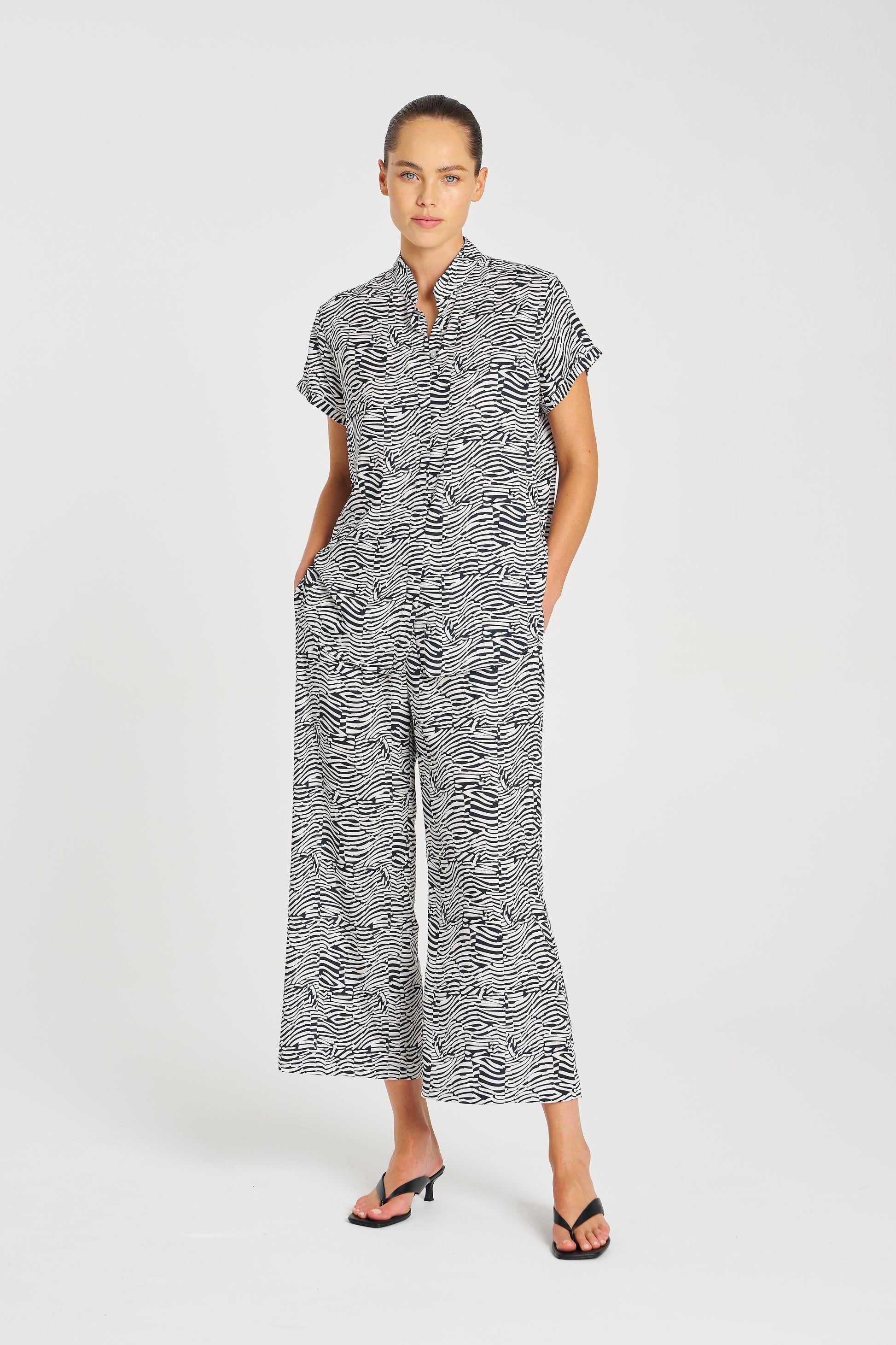 | The Pace Pant highlights a wide leg silhouette in a cropped length. Crafted with Mela Purdie’s smooth fluid stretch Charmeuse fabrication in the classic geometrical Terrain Print. These elasticated waist pants allow for comfort suitable for all occasions to be dressed up or down. - Technical stretch satin - European fabrication - Wide Leg, standard rise - Elasticated waist - Pockets at hips - Cropped length - Designed & made in Australia |
