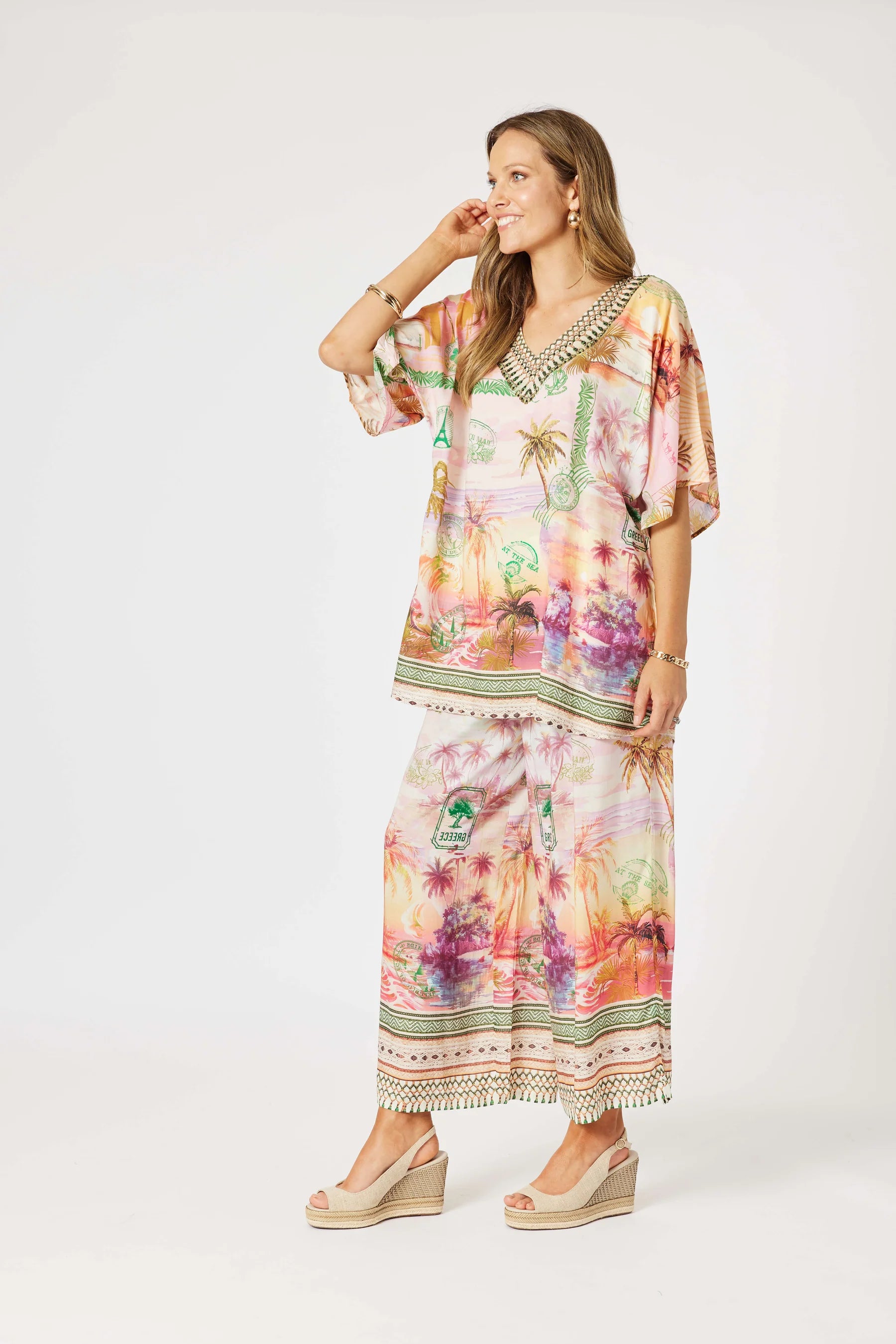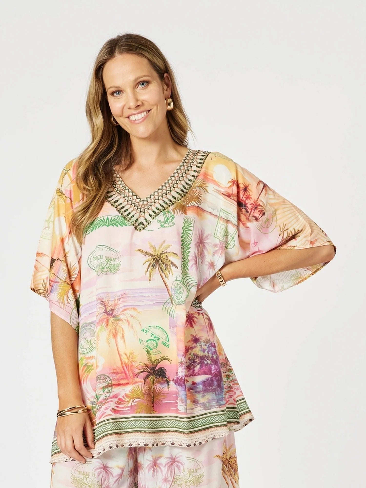 - Make a statement with the Passport Print V-Neck Top, where relaxed style meets tropical escape.
