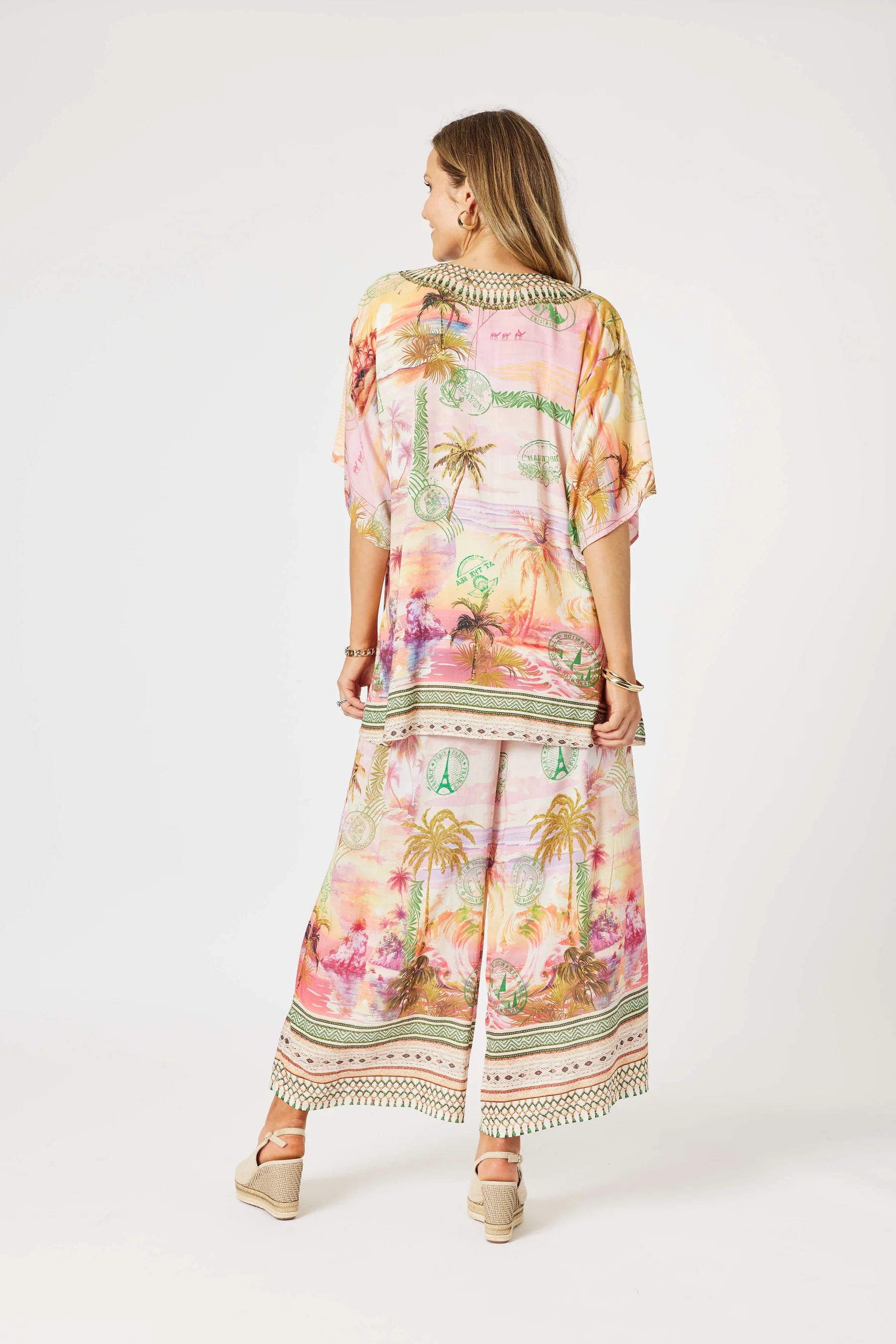 - Featuring a dreamy sunset-toned landscape with palm trees and passport stamp graphics, this top brings vacation vibes to any day.