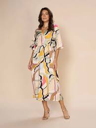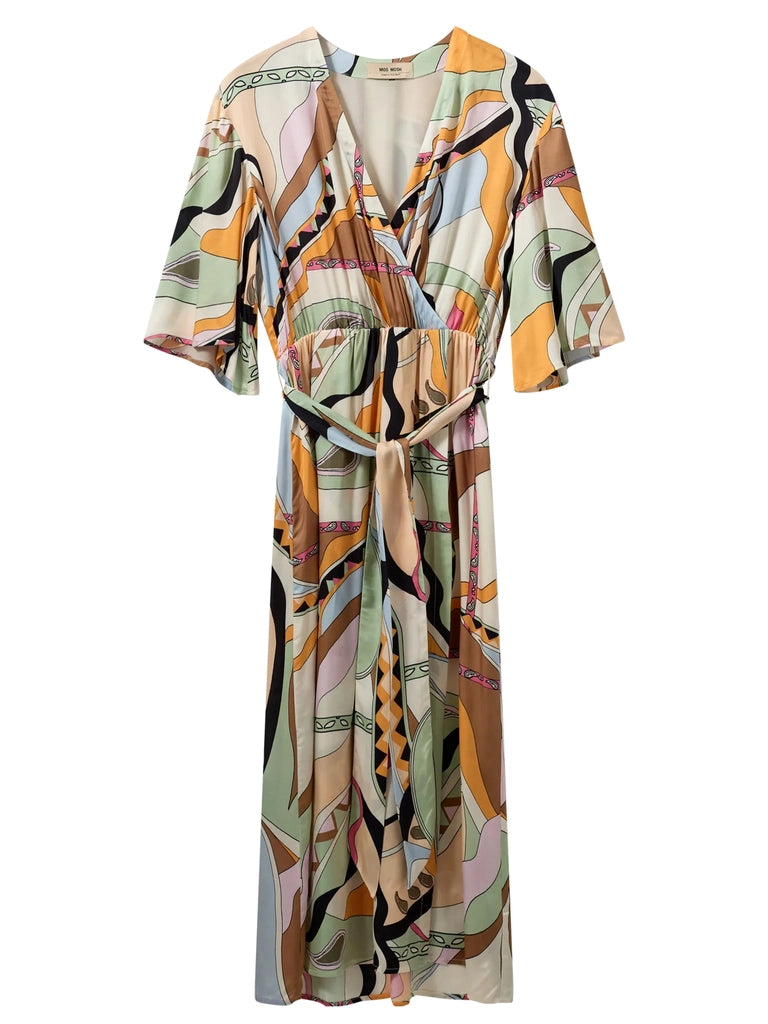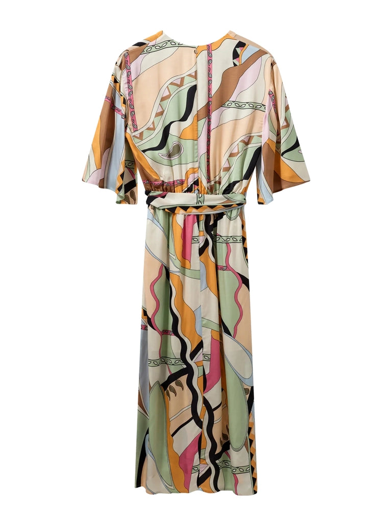 This A-line midi dress with a V-neck and straight short sleeves is a stylish choice. The dress has a geometric and abstract pattern, perfect for a date night. The feminine style makes it a must-have for any occasio