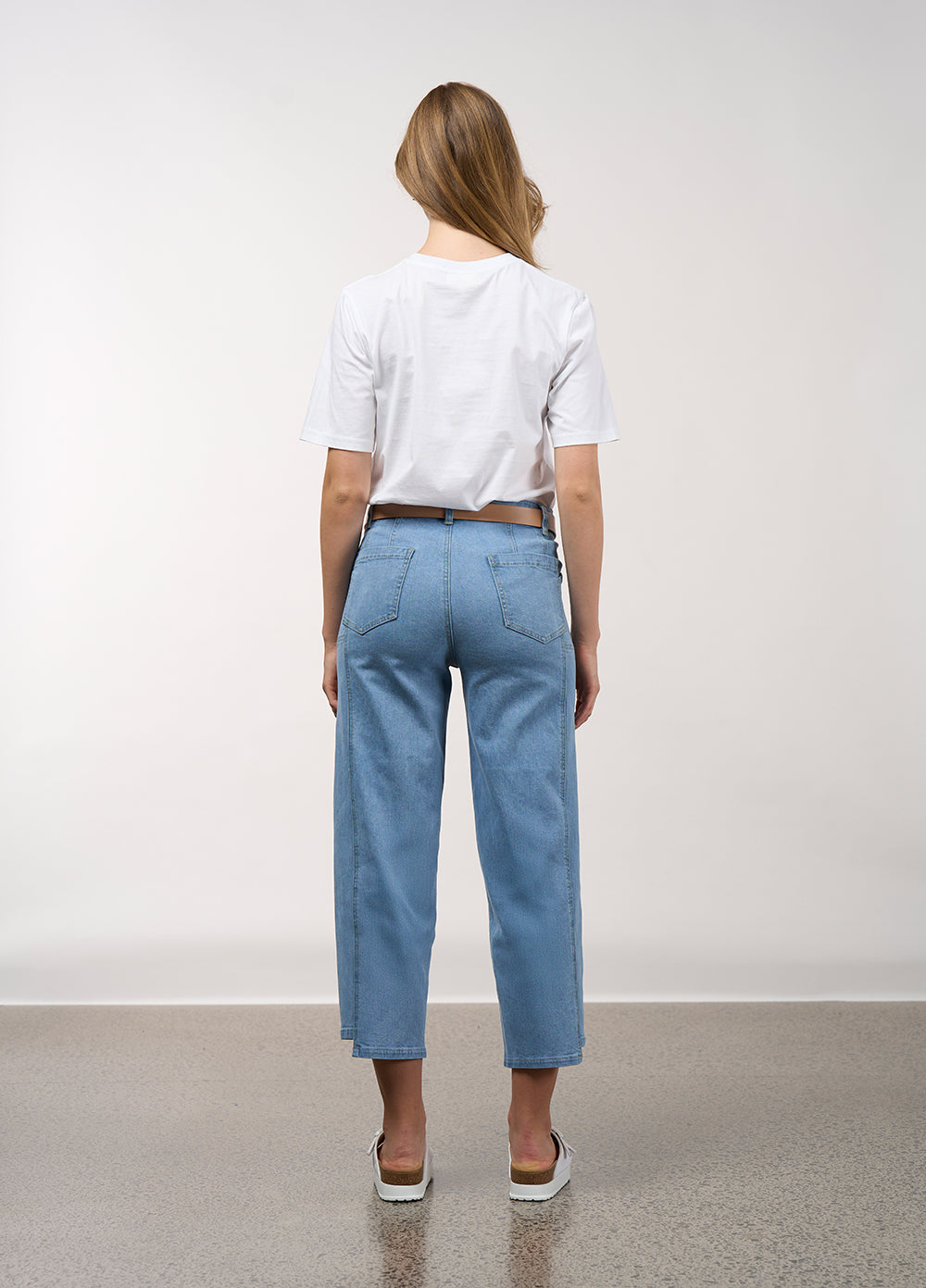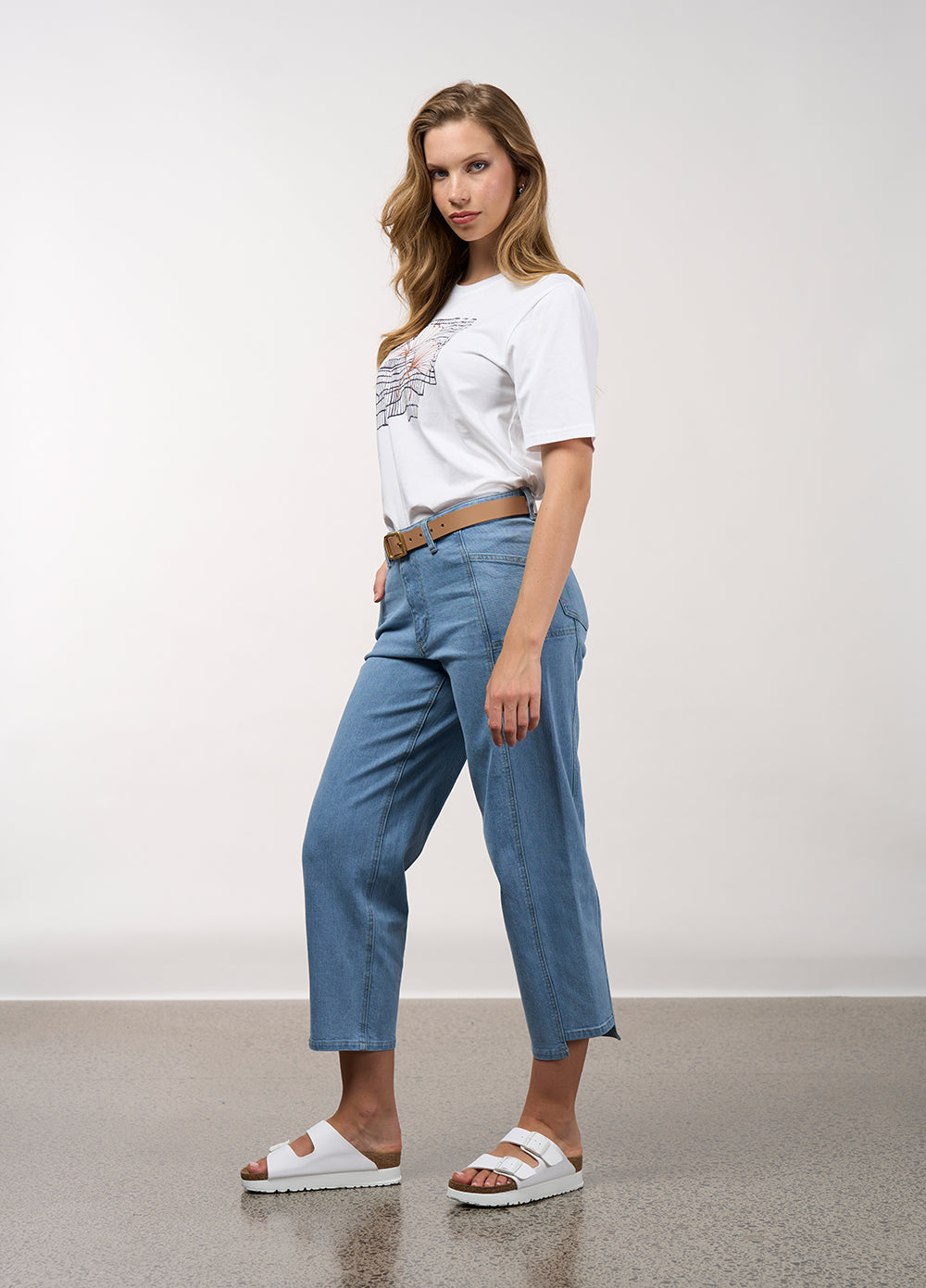 Relaxed fitted jean with a subtle tulip leg shape, with front angled pockets. Featuring side panels that are stepped at the hem, back patch pockets and signature MS branded hardware.