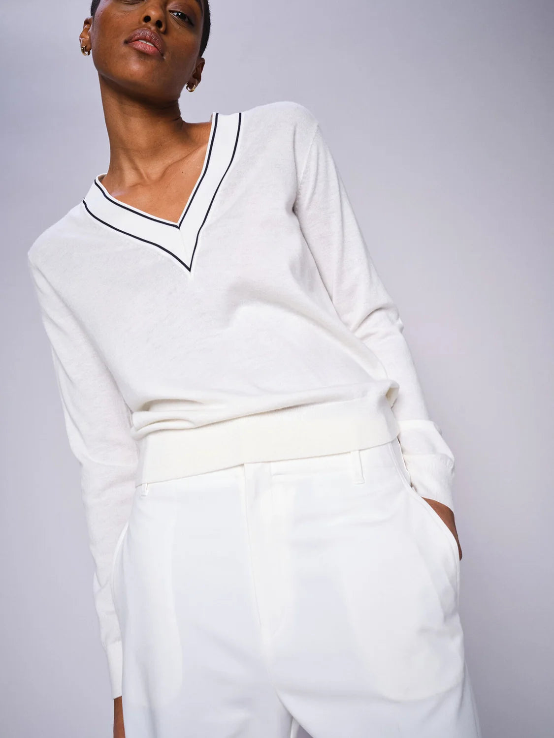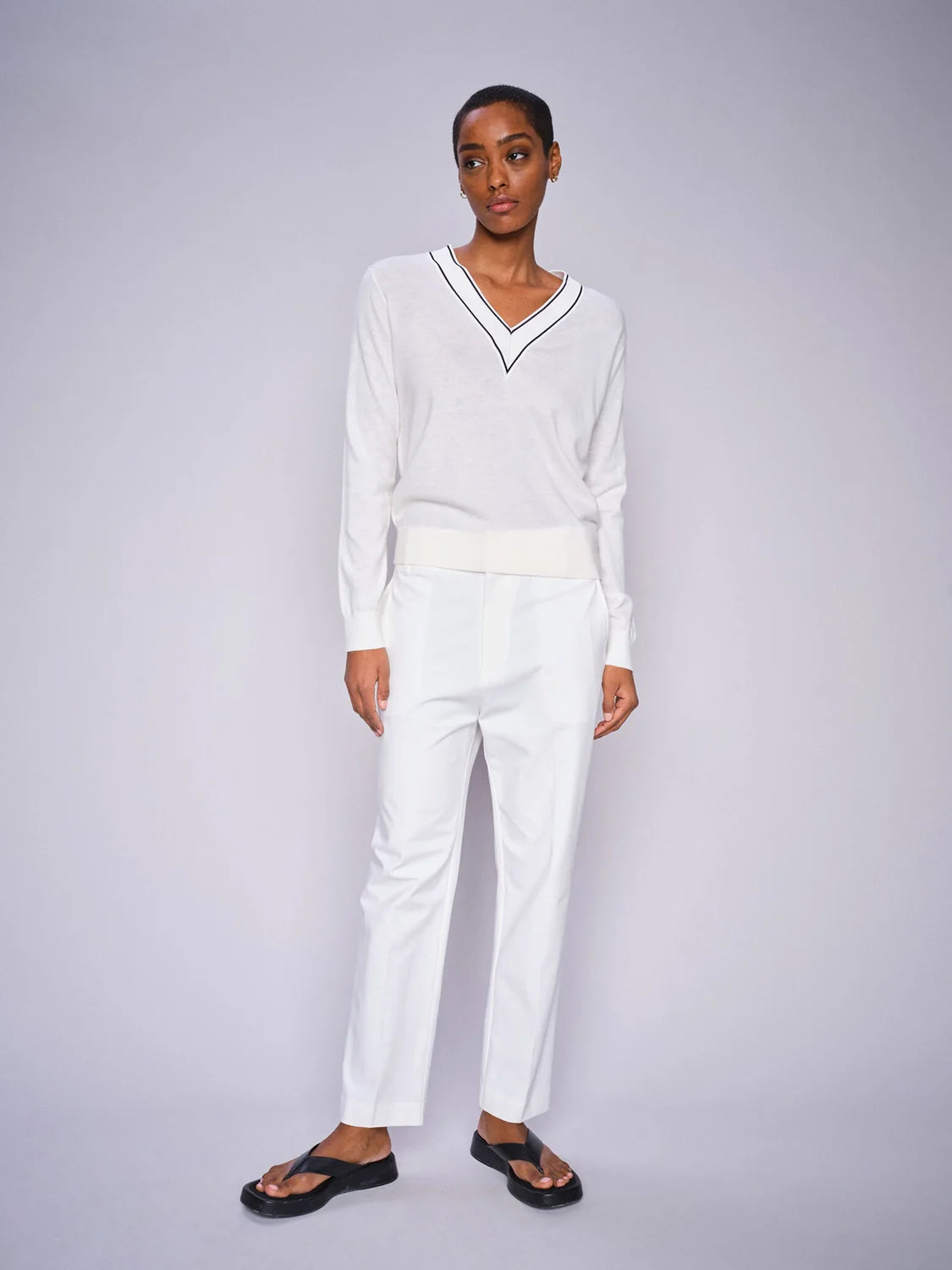 Featuring a fitted silhouette and a sporty stripe along the flattering V-neck, it pairs perfectly with chinos or dark blue denim for a polished look.