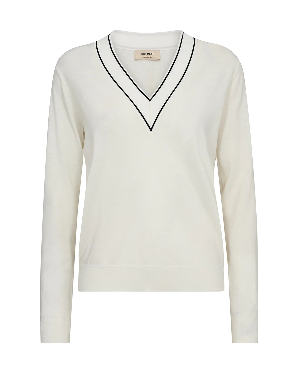 Add a touch of preppy charm to your wardrobe with this versatile knit from Mos Mosh, crafted from a responsibly sourced wool and polyester blend for a luxuriously soft feel. Featuring a fitted silhouette and a sporty stripe along the flattering V-neck, it pairs perfectly with chinos or dark blue denim for a polished look.