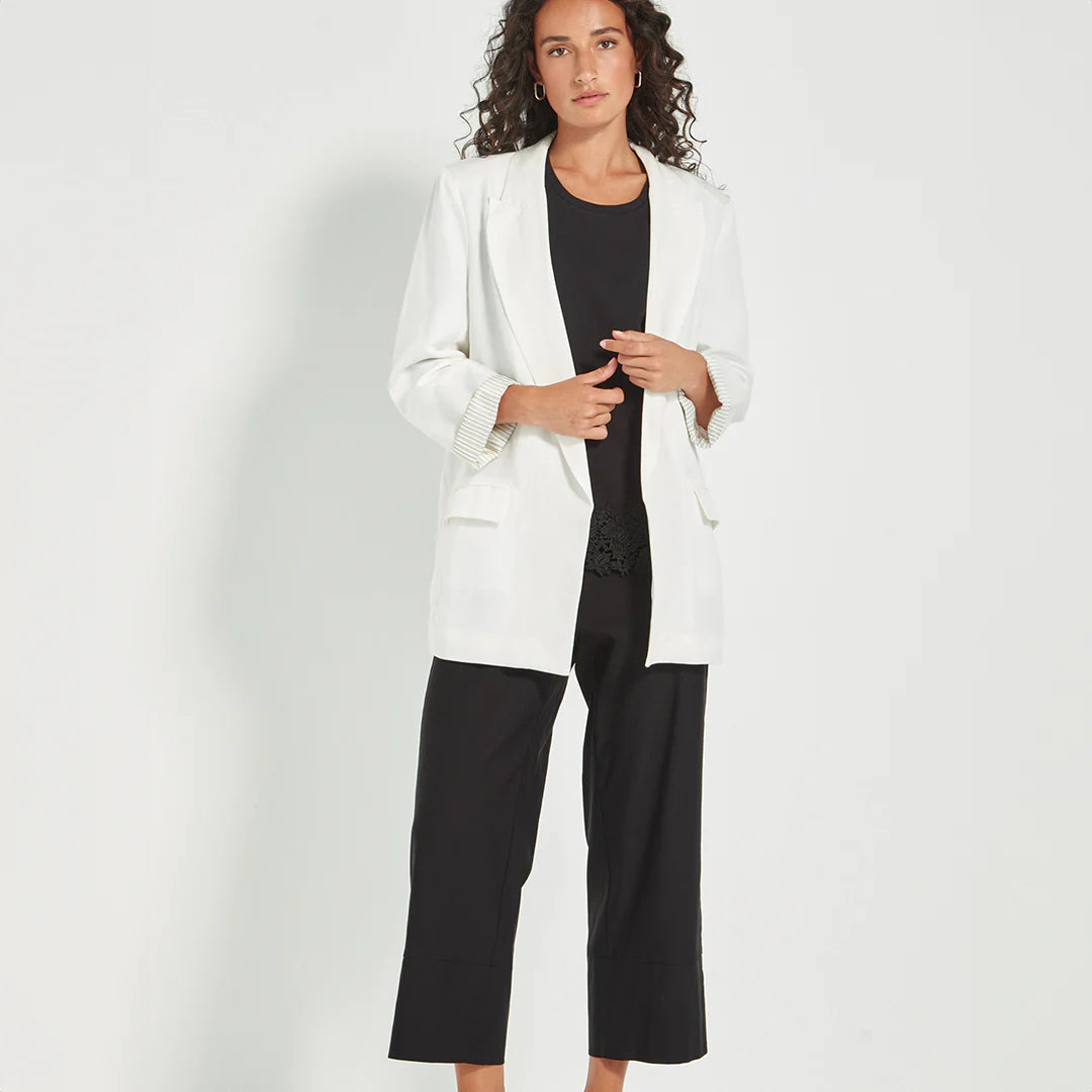 A modern essential with elevated ease, the Rico Pant is crafted from an ultra-soft rayon-nylon-elastane blend that delivers all-day comfort while retaining its shape. Featuring a flat front waistband with self-binding and an elasticated back for a flexible, flattering fit, this pant balances style and comfort seamlessly. Slant front patch pockets and back patch pockets lend a laid-back utility, while the wide 7/8 leg is finished with a deep cuffed hem and subtle side splits—adding a cool, contemporary edge. Easy to dress up or down, the Rico Pant is a must-have travel essential.