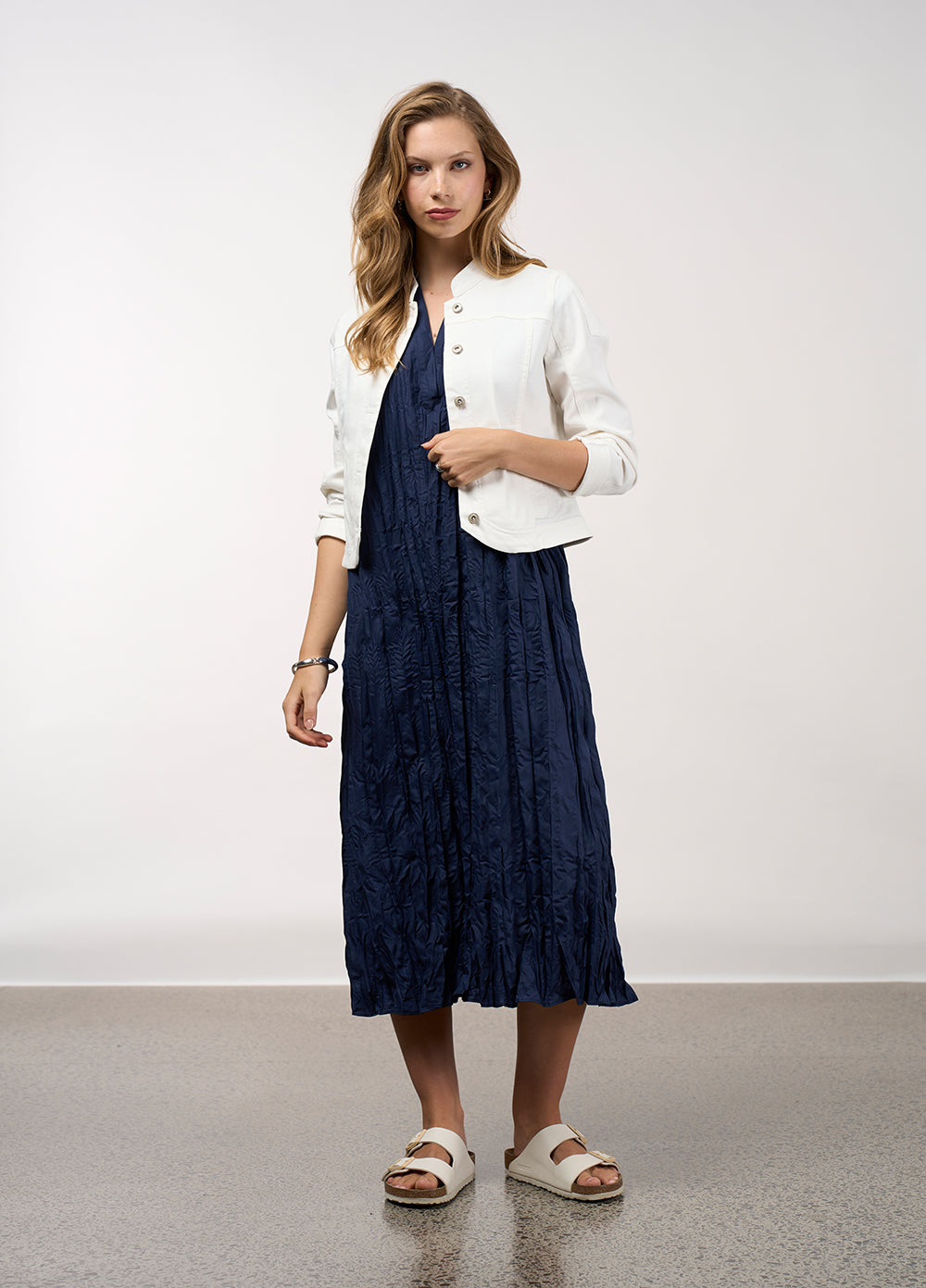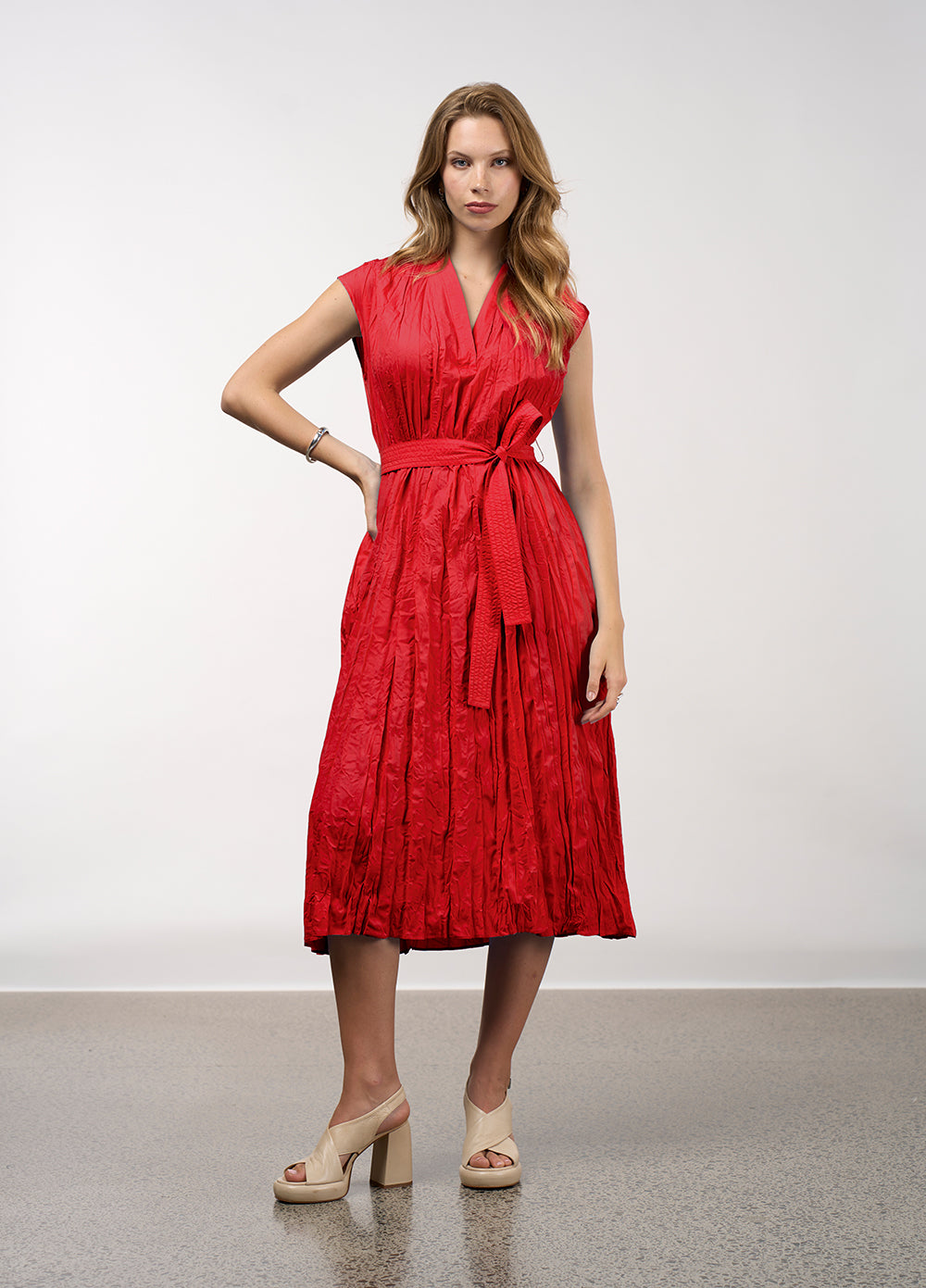 Midi length a-line dress with a deep V neckline in a permanent crinkle texture, with grown-on capped sleeves and an optional belt with top stitching detail.