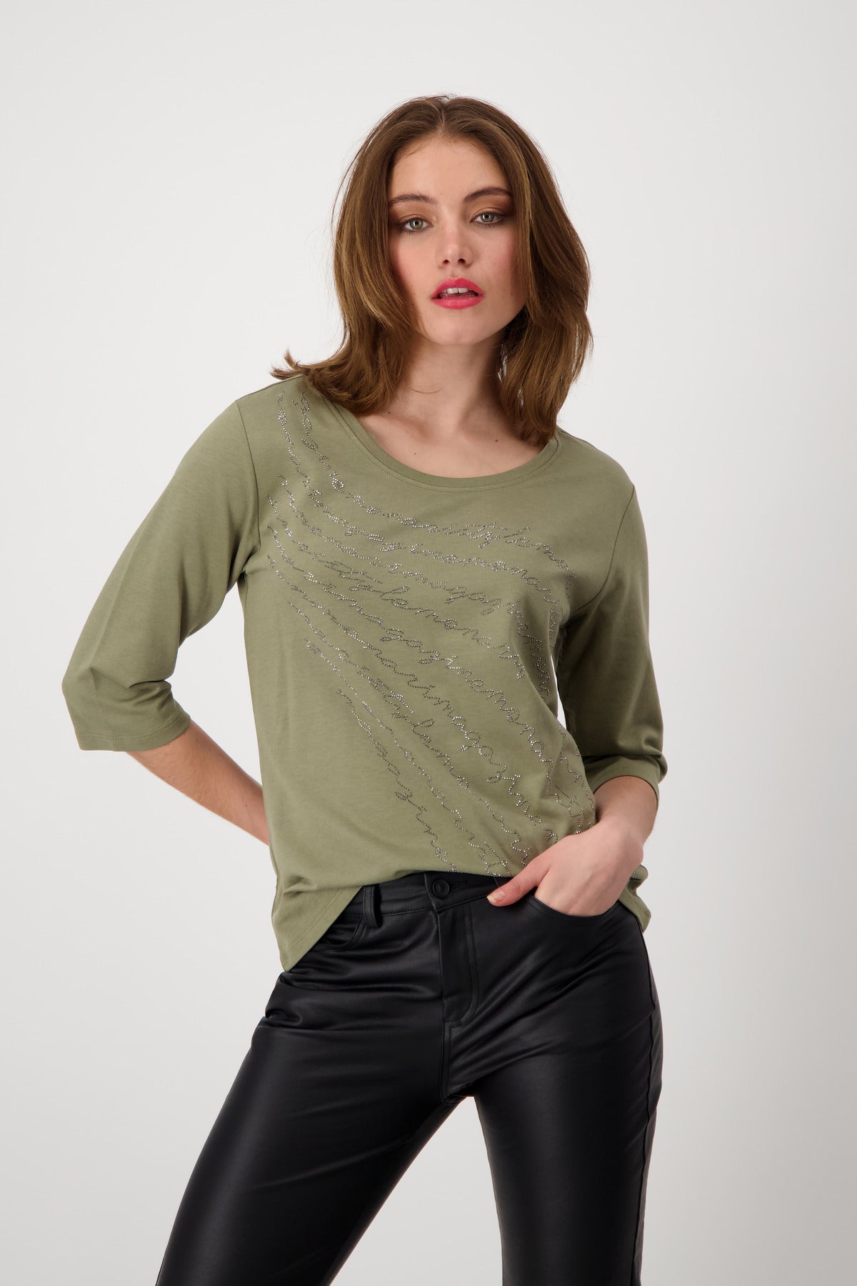 This shirt made of a high-quality cotton blend impresses with glittering rhinestone lettering. 50% Cotton 50% Modal |