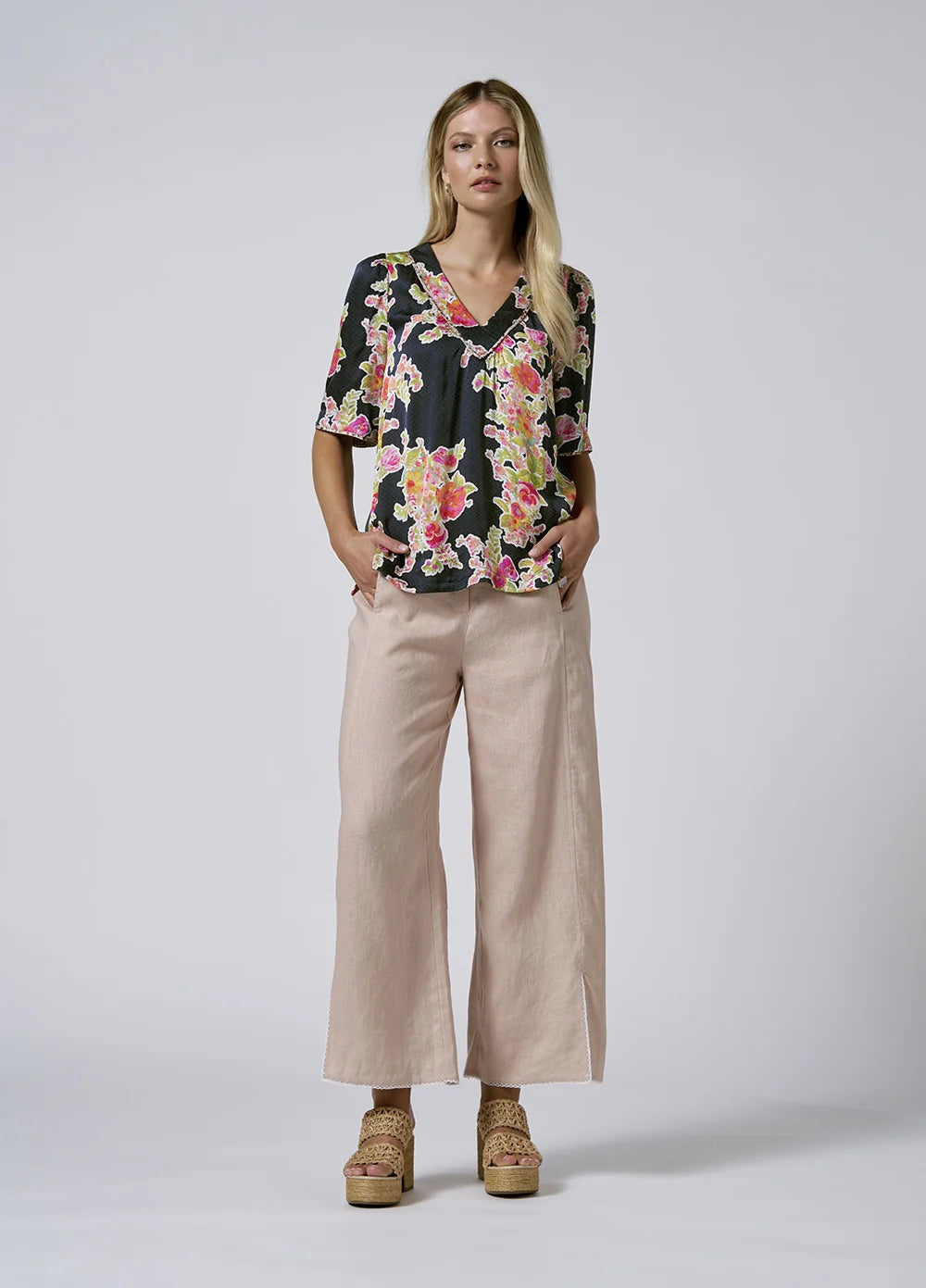 Discover effortless elegance with this floaty tee, crafted from luxurious silky viscose. The deep V neckline adds a flattering touch, while the gathered topstitching introduces a unique, stylish element. Perfect for any occasion, this top seamlessly blends comfort with chic sophistication.