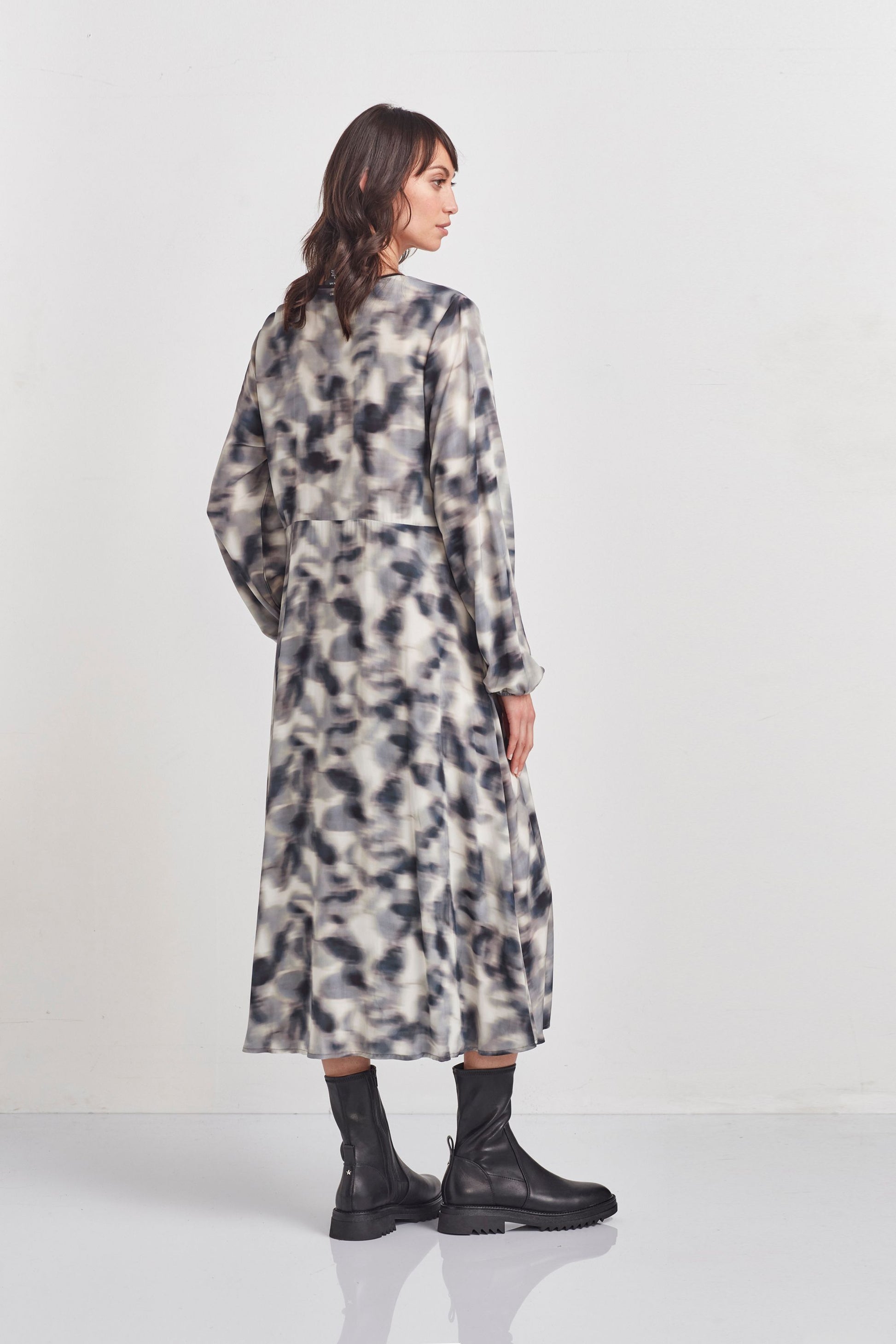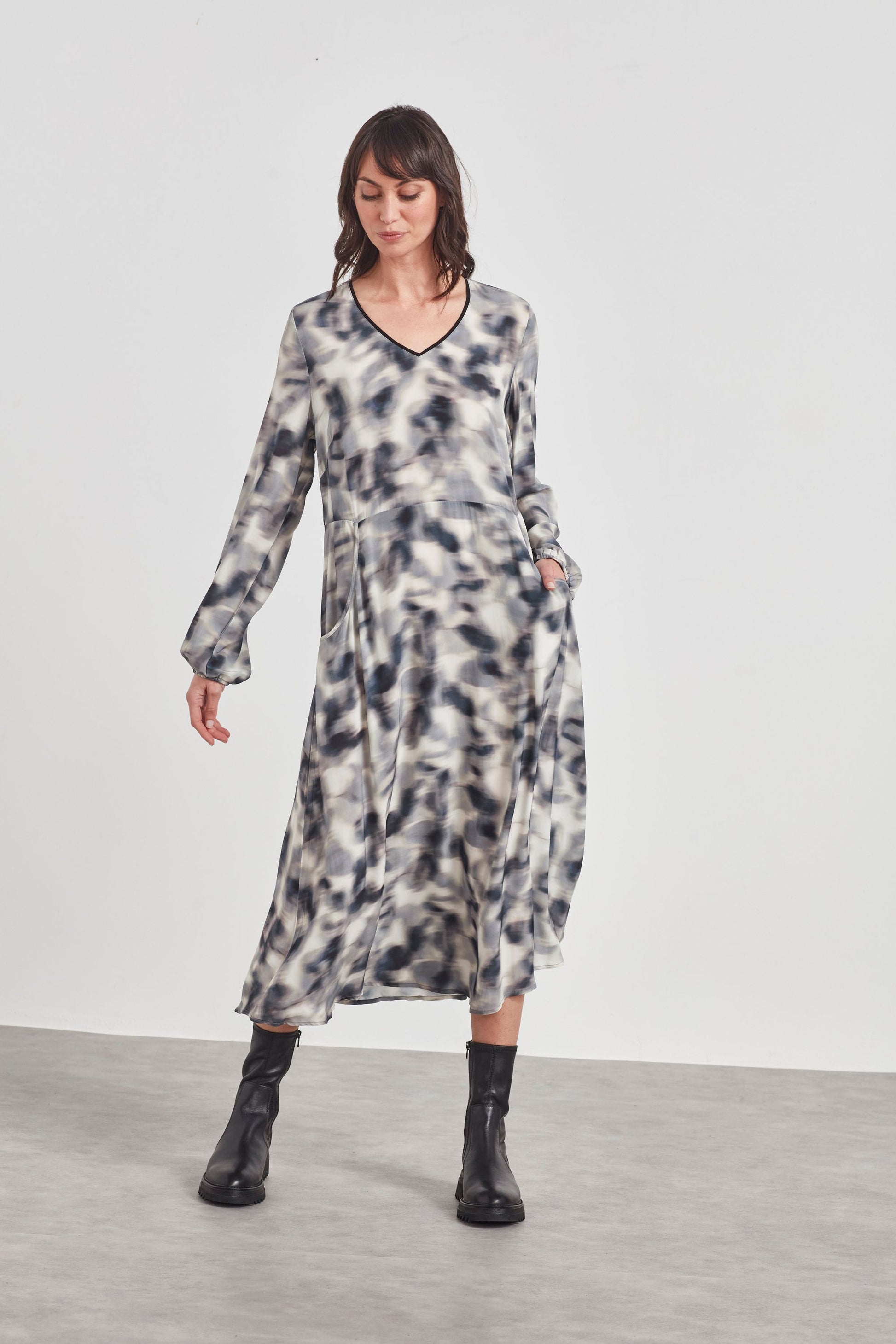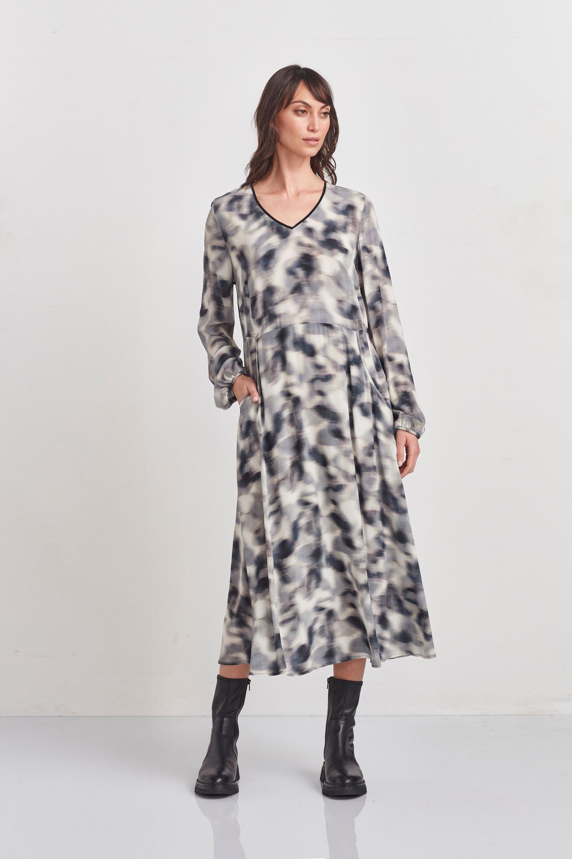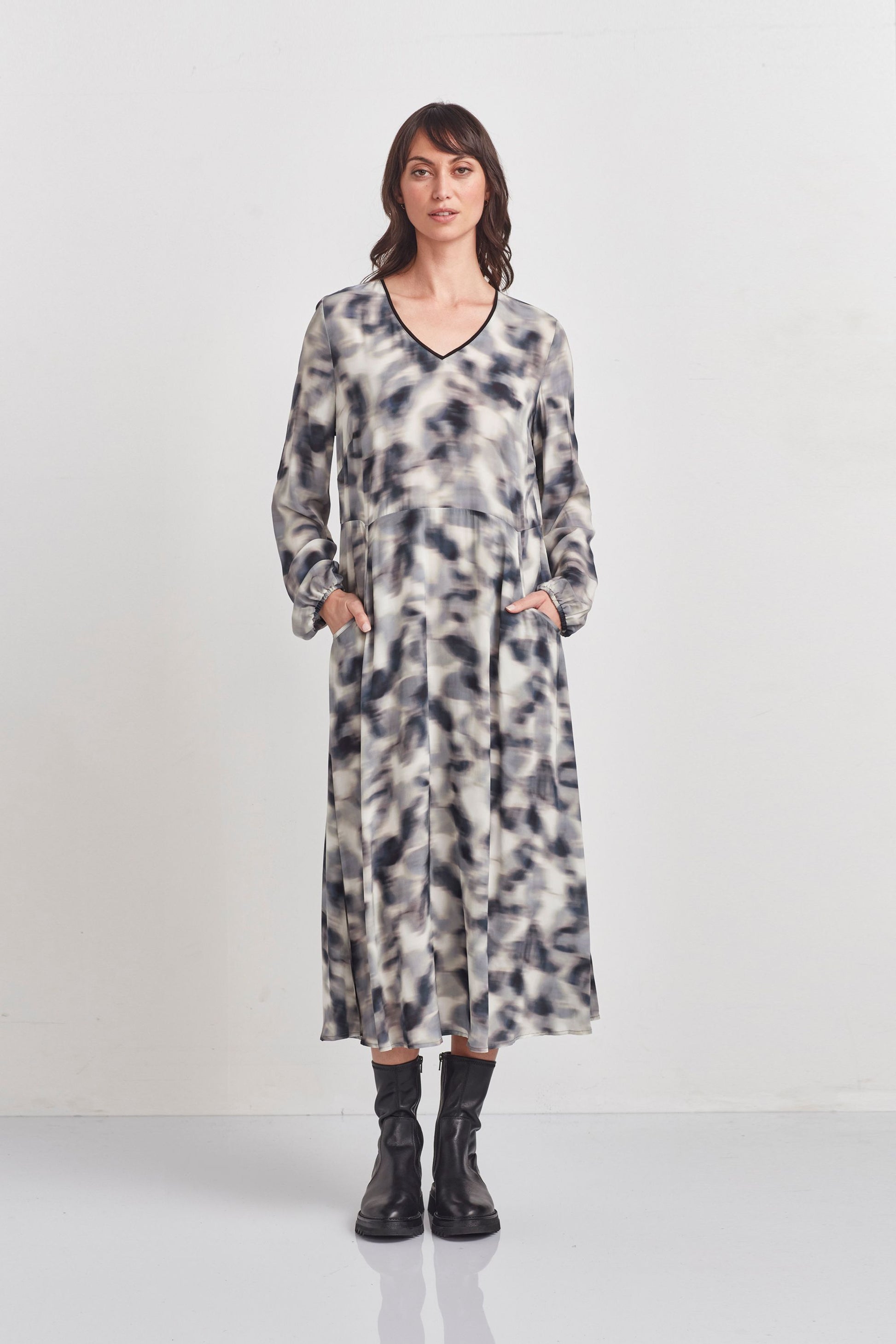 Elegant Shadow print dress with Black piped V neckline. Relaxed fit dress is waisted with side pockets. Full length sleeve with half shirred cuff. The Shadow dress falls to mid calf.