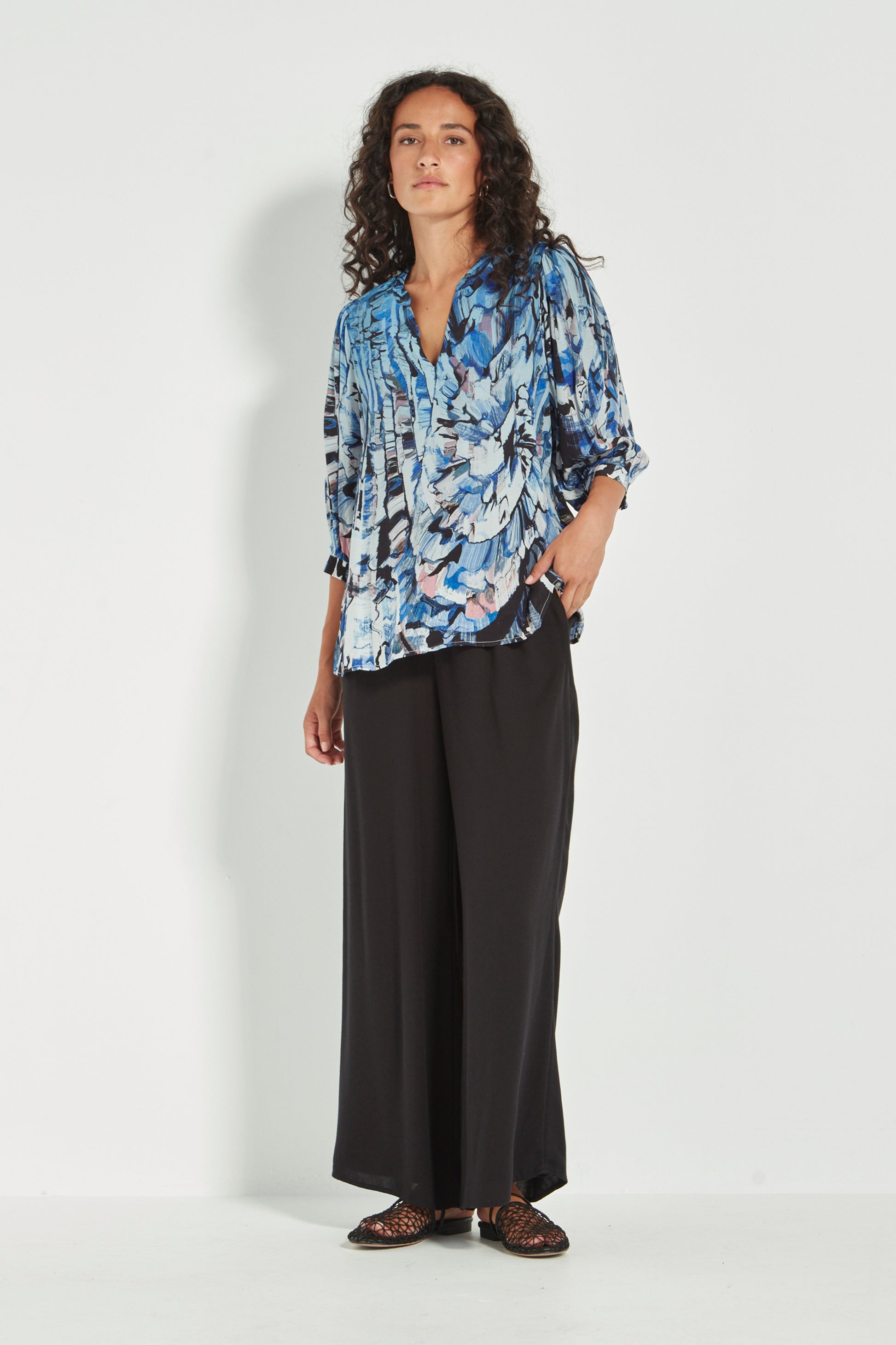 The Skyline Top is a refined piece that transitions effortlessly from day to evening. Crafted in an exclusive Verge print, it features a soft V-neckline with a Nehru collar, allowing the print to take centre stage. Elbow-length sleeves are softly gathered and finish into a flat cuff for a tailored feel, while elastic at the back offers an easy, comfortable fit. The gently flared hem skims the hip and is finished with side splits for subtle movement and a flattering silhouette.