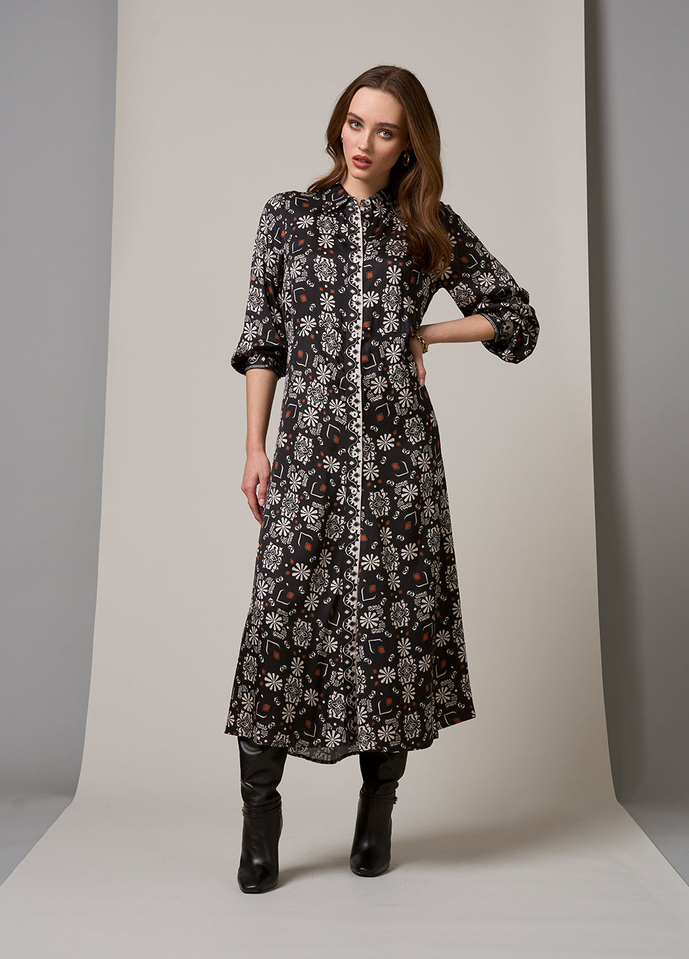 Button-through shirt dress, with a under bust seam and centre back seam for a flattering fit. With blouson sleeves and half panelled shirred cuffs.
