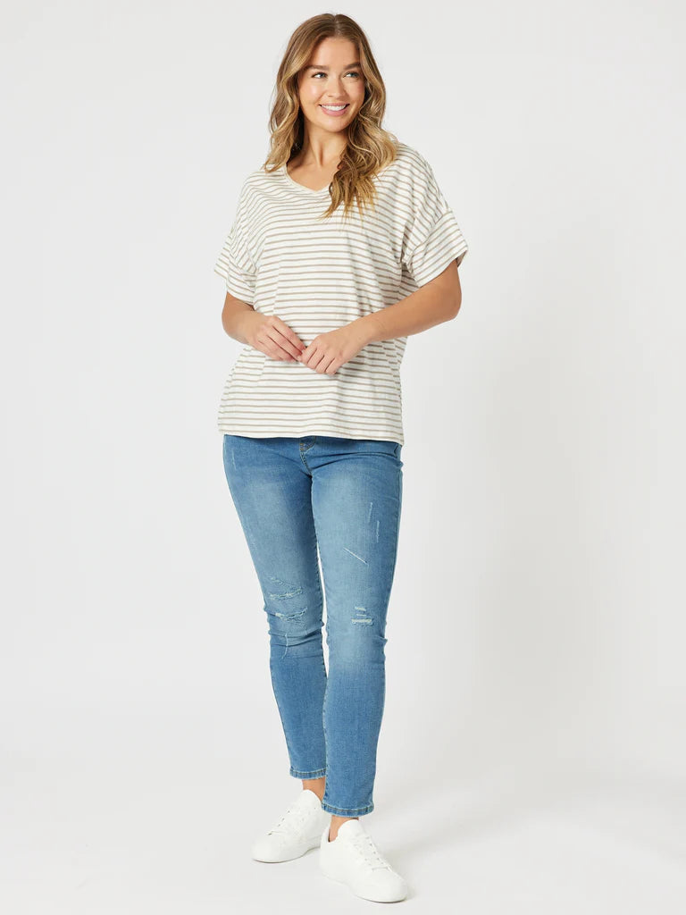 - A playful twist on a classic stripe. The Tyla Stripe Tee is your everyday go-to, reimagined with a relaxed fit, mixed stripe sleeves, and a touch of sparkle at the neckline.