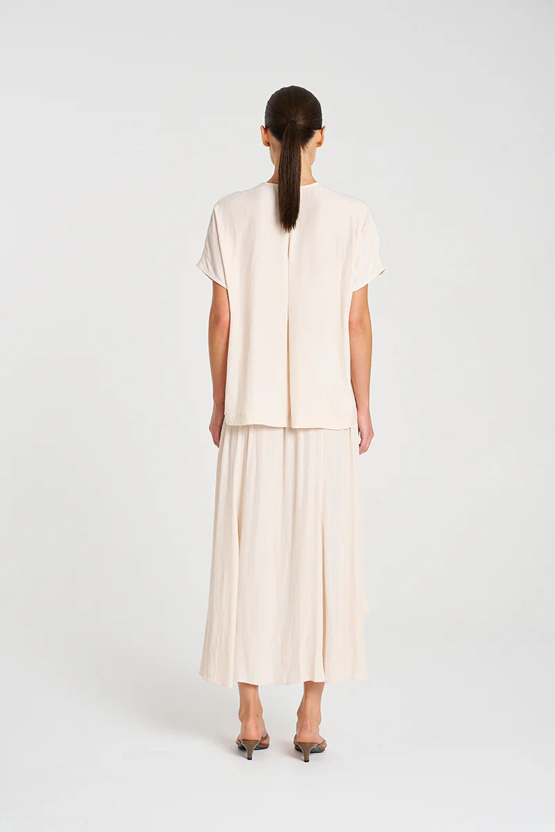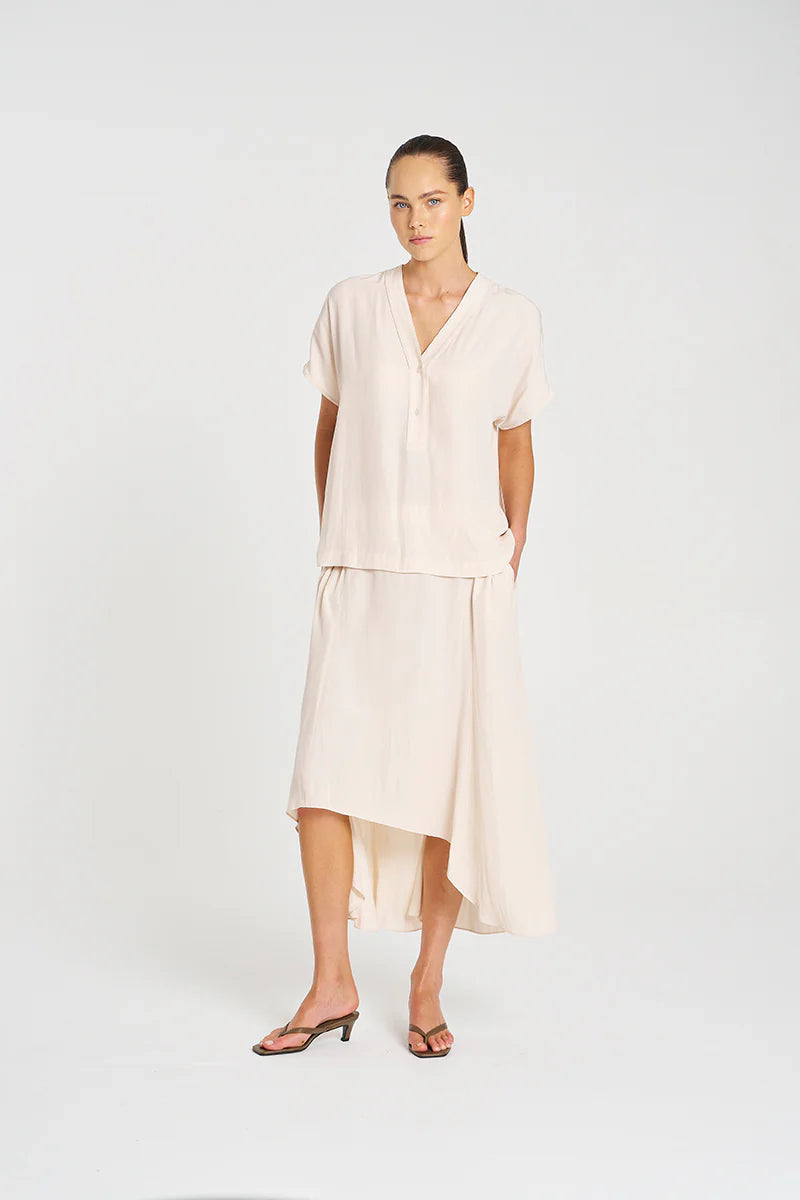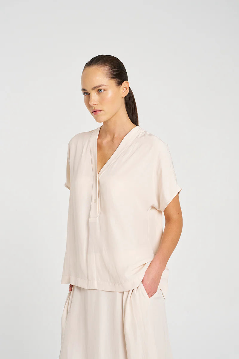 Crafted from Mela Purdie's classic Mache, a fine Denier technical weave with an airflow finish. The Wedge Tab Shell features a cap sleeve and a flattering neckline with a button closure.